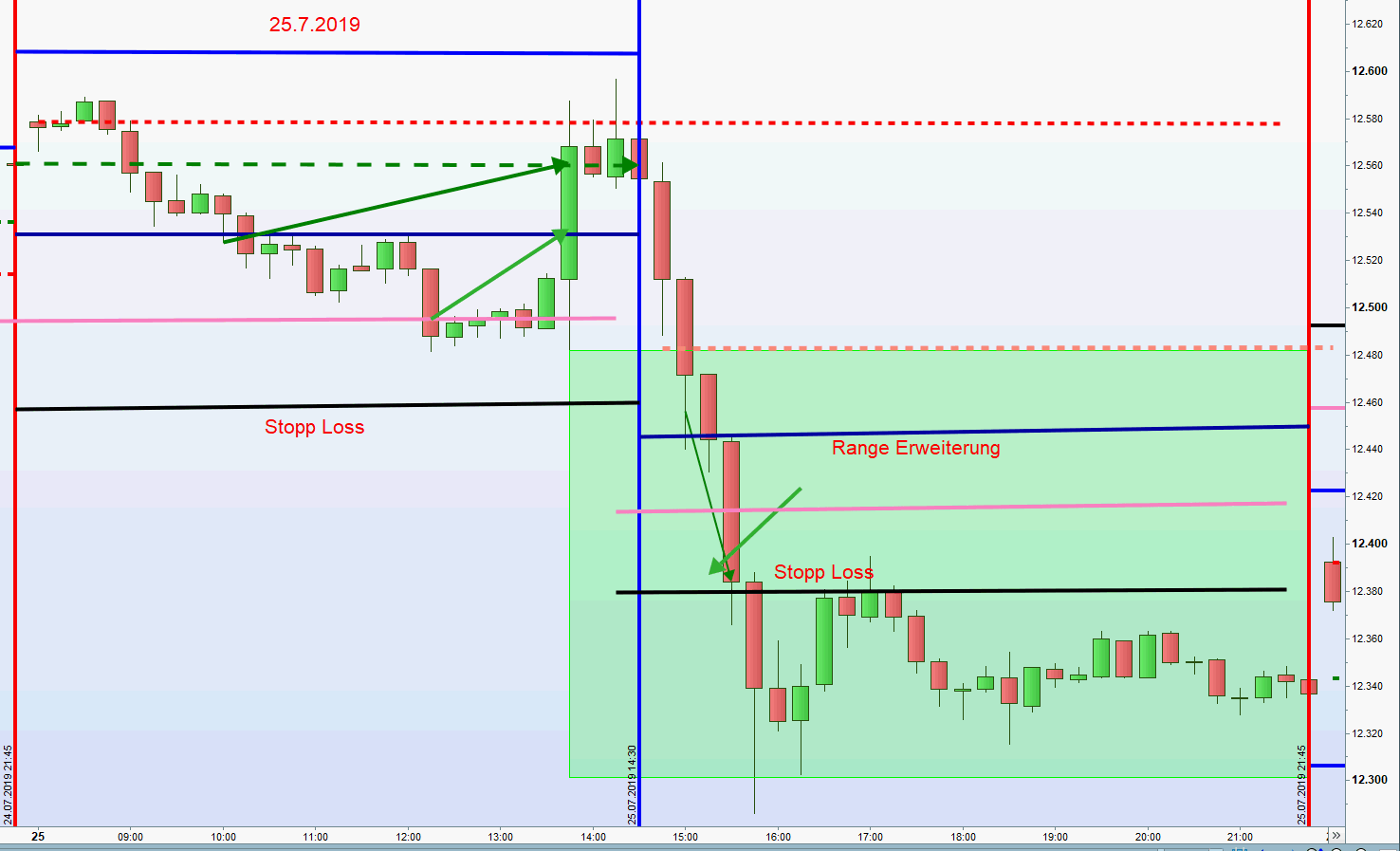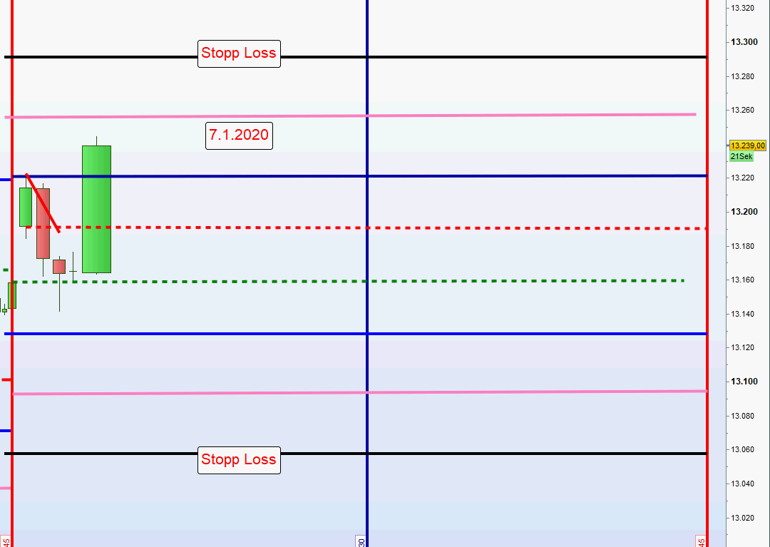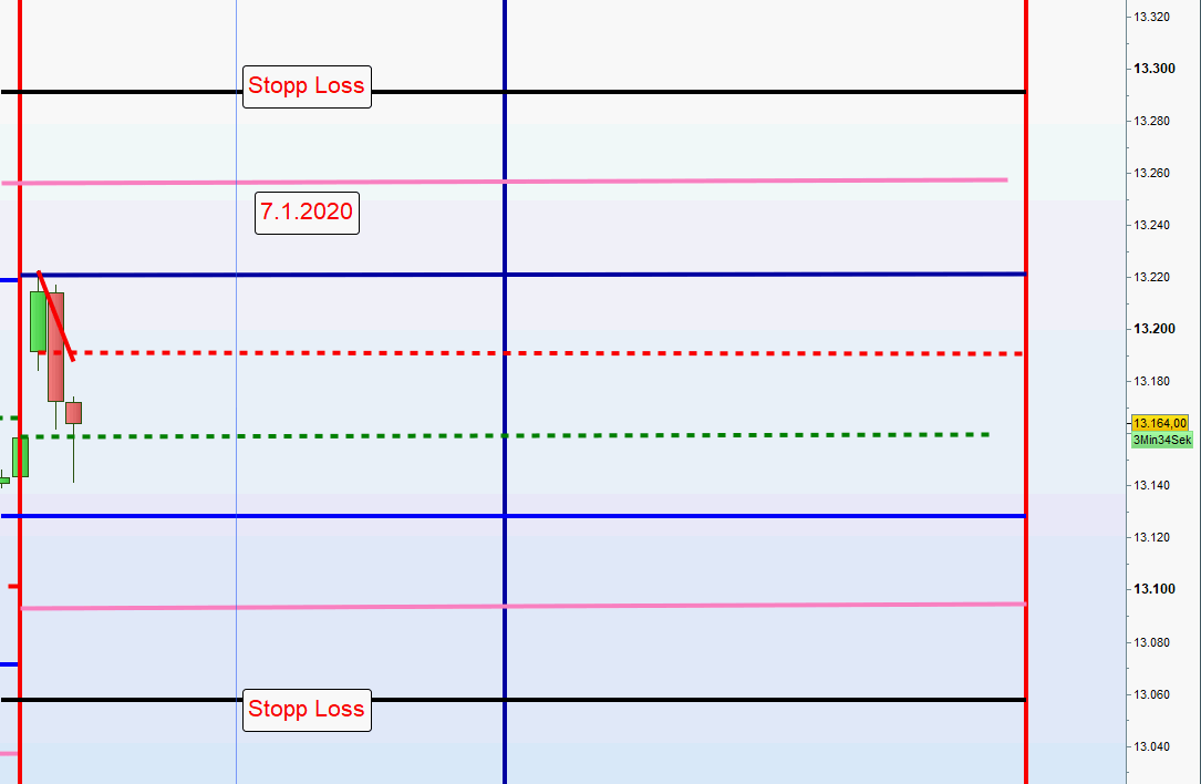 2.Handel zum Mittelkurs, wenn Kurs die morgens definierte Stopp Loss Linie durchhandelt. Short und Long