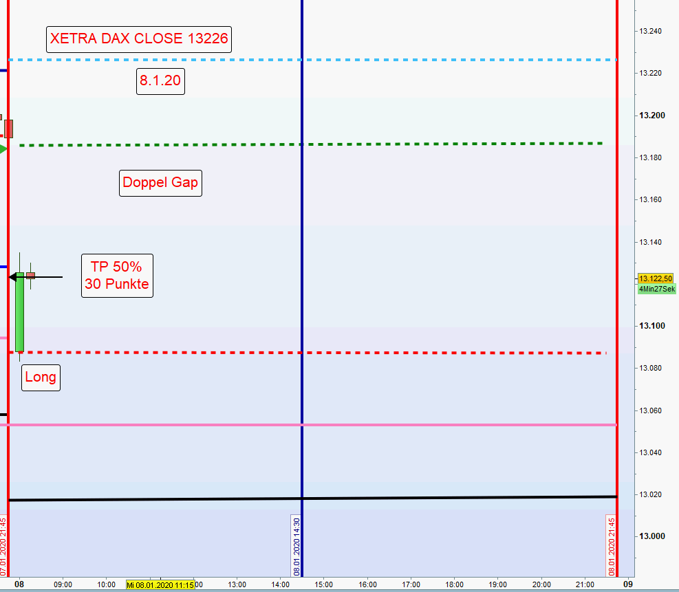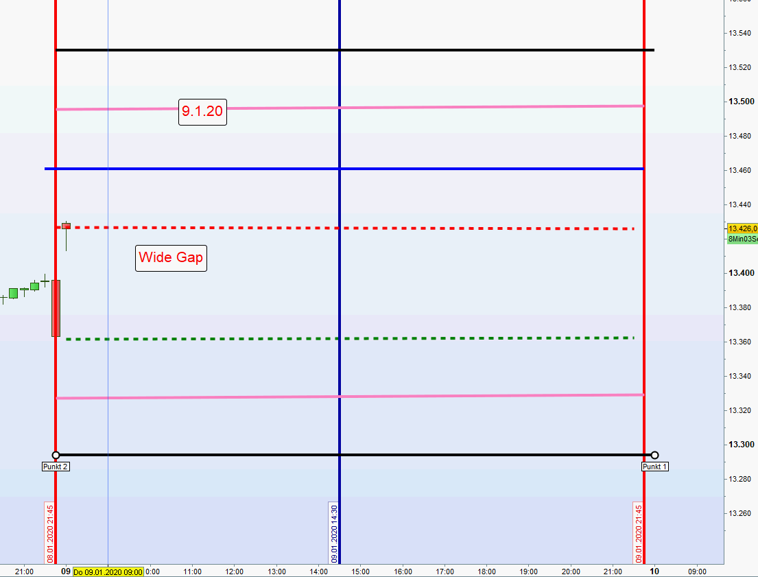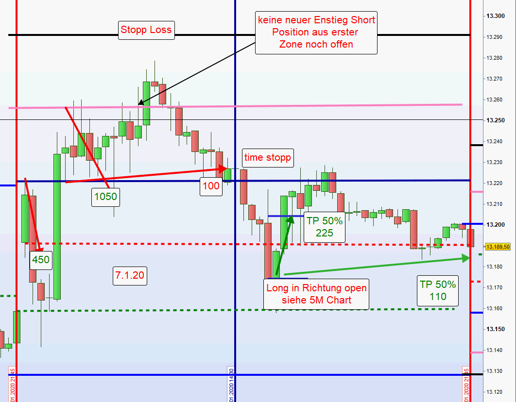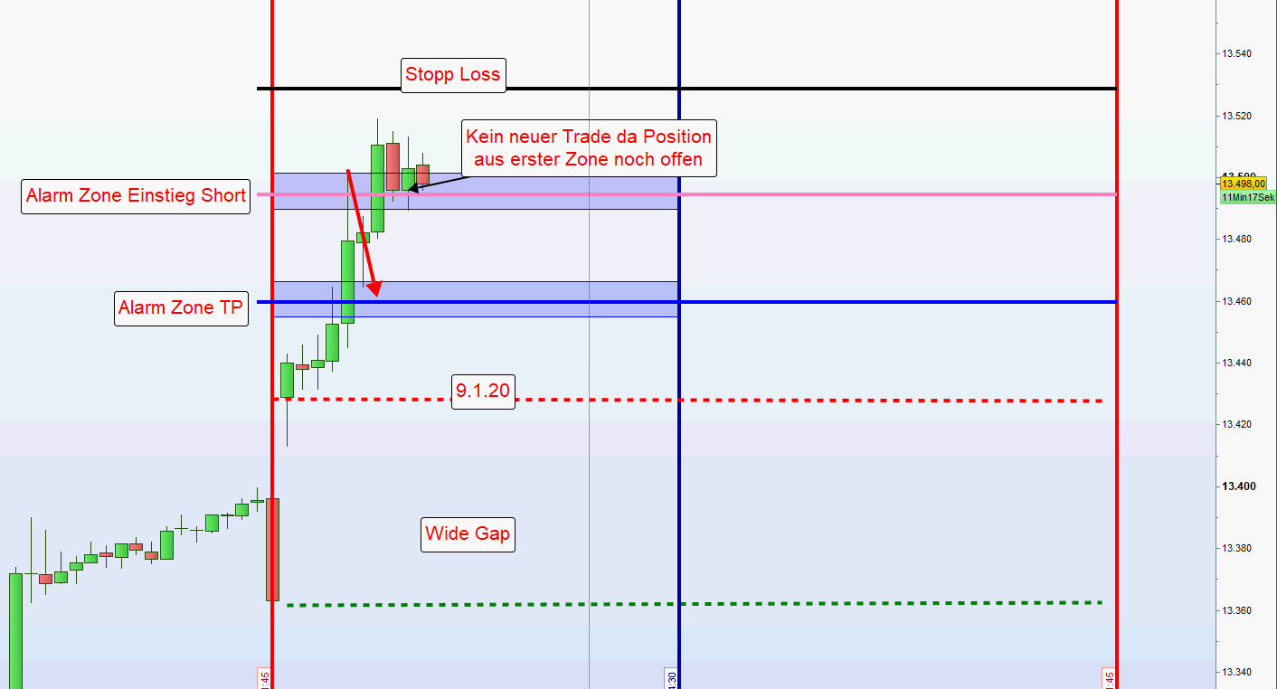 Die Gemengelage lädt nicht zu einem Trendtag aber auch nicht Handel Short Doppel Gap ein. Habe mich daher für den Handel einer Wide Gap entschlossen. Das bedeutet short an den Zonen über dem Eröffnungskurs und long wenn Gap geschlossen wird.