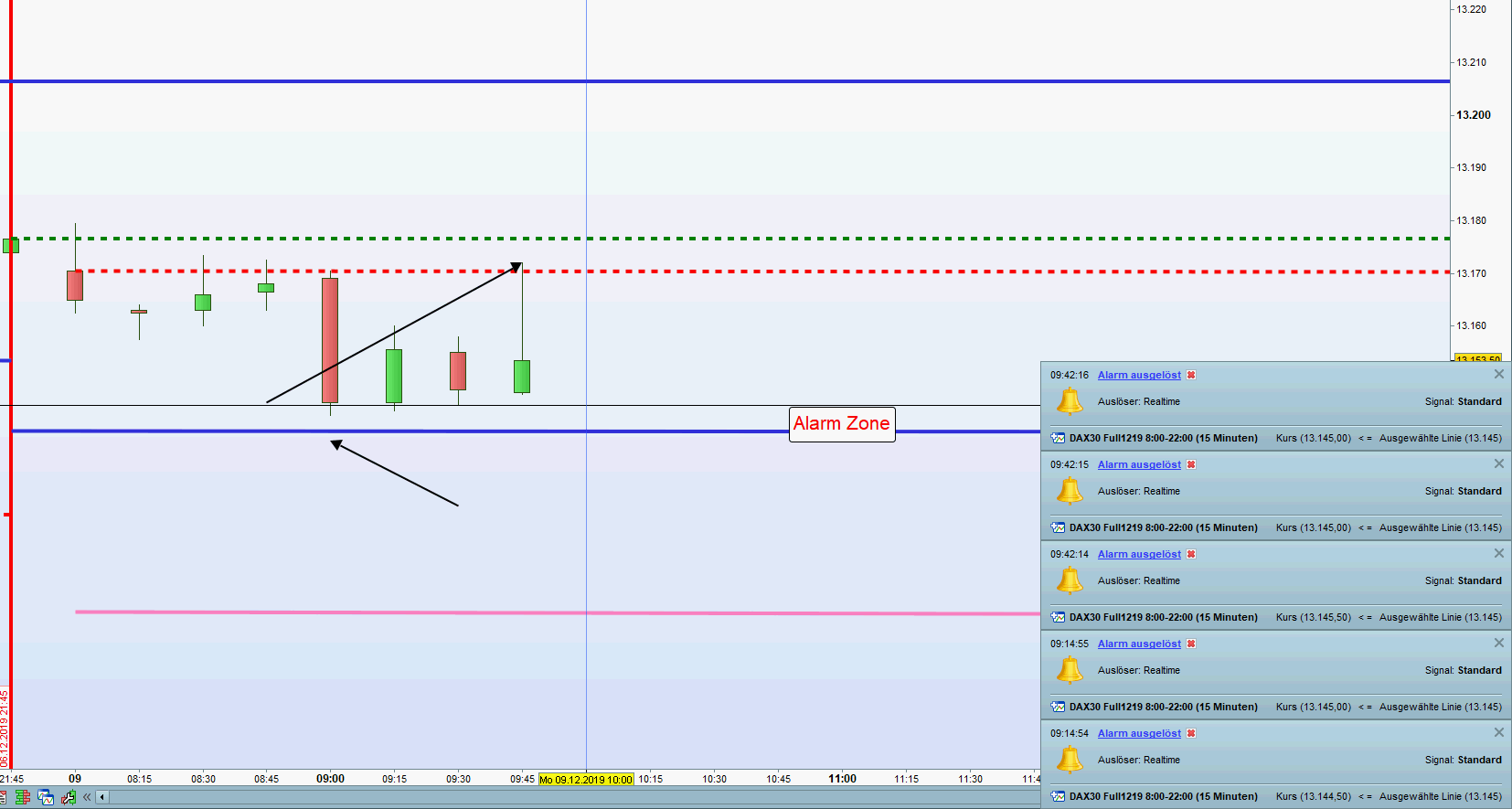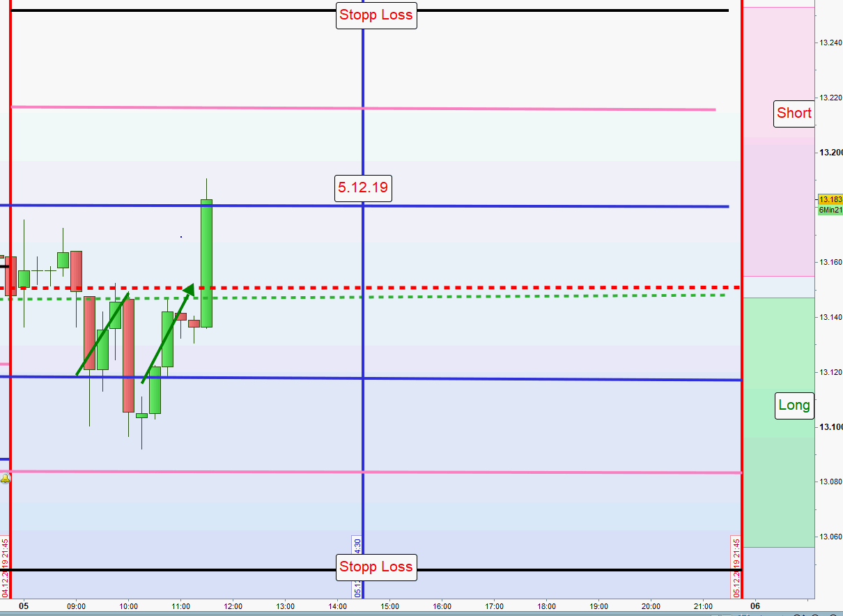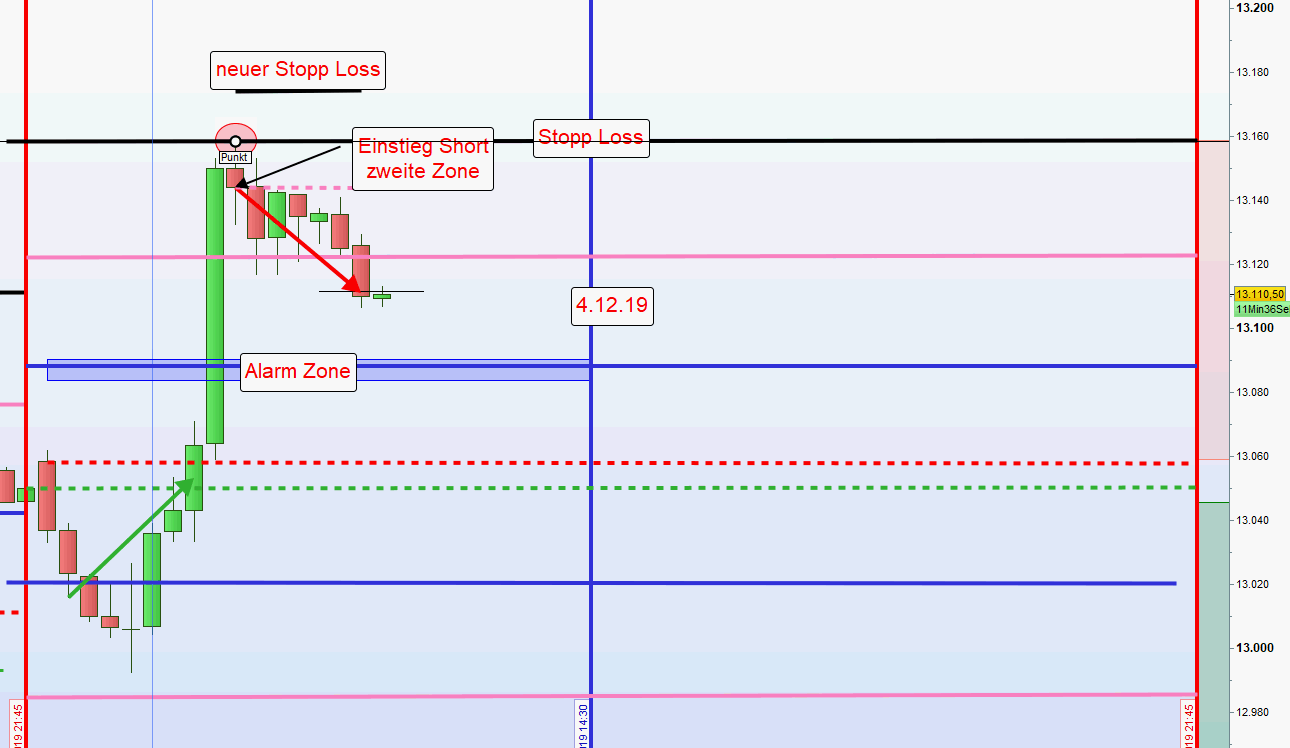 Gemäß meiner händischen Einstiegstechnik erfolgte kein Einstieg Short an der ersten Zone sondern erst nach einer Umkehrkerze. Daraufhin werden zweite Zone Short und Stopp Loss neu angepasst.
