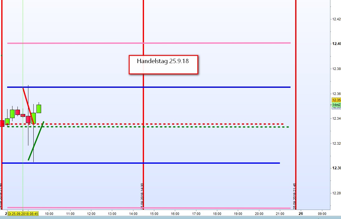 Viele Handelstage haben bis 14:30h, Beginn der US Vorbörse, ihre Handelsspanne nicht ausgeschöpft. In Anlehnung an das Market-Profilewird die Handelsspanne bis 14:30h als Value Area eingezeichnet. Von diesen wiederum werden die dann aktuellen Zonen gehandelt Die meisten Gewinne, bis zu 80%, werden vormittags erwirtschaftet und ab 14:30h bestimmen in der Regel die DJIA FUT sowohl als auch die Notierung VDAX-NEW weitere Kursentwicklung des FDAX.