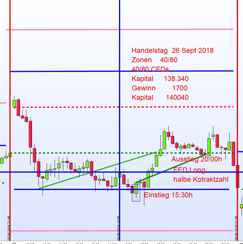 In Zukunft werden Handelstage der FED Zinsentscheidungen wie folgt gehandelt: Long mit Eröffnung FDAX ab 15:30h Kursziel um 20:00h Kapitaleinsatz: Hälfte der üblichen Kontrakte. Wenn Einstieg long erfolgt, nicht an einer roten Kerze, dann ist der Einstieg die erste Zone. ( Es ist ein Versuch, denn die Stimmung an der US Börse ist wegen der möglichen Zinserhöhung nicht bestens.)