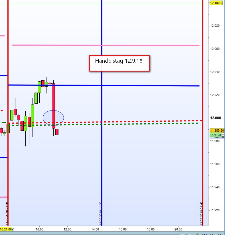 Im Verlauf wurde die erste Zone mit Elan durchgehandelt. Wurde dort eine Position Short eröffnet, dann muss an der zweiten Zone mit einem erneuten Einstieg Short höchste Vorsicht walten. Erfolgt jedoch ein Korrektur bis zu einer Stunde, dann darf in direkter Nähe der zweiten Zone ein erneuter Einstieg erfolgen. Die Position aus der ersten, einmal im Gewinn, muss rechtzeitig geschlossen werden. Für Statistik jedoch mit einem Zeitstopp kurz vor 14:30h. -