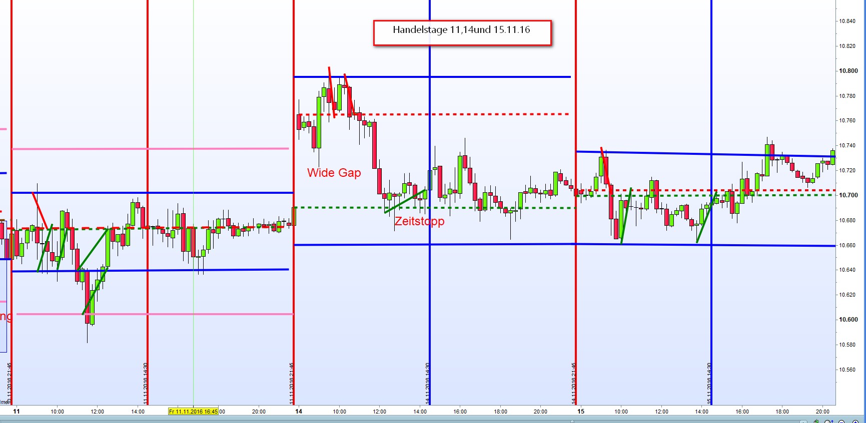 Am 10.11.16 wären sowohl alle Positionen am Vormittag wie nach der Range Erweiterung mit Höchstverlust um paar Punkte ausgestoppt worden. Eine ganz seltene Konstellation. Gemäß dem mit letzten Beitrag erklärten Trade Management fiel ein sehr hoher Gewinn an.