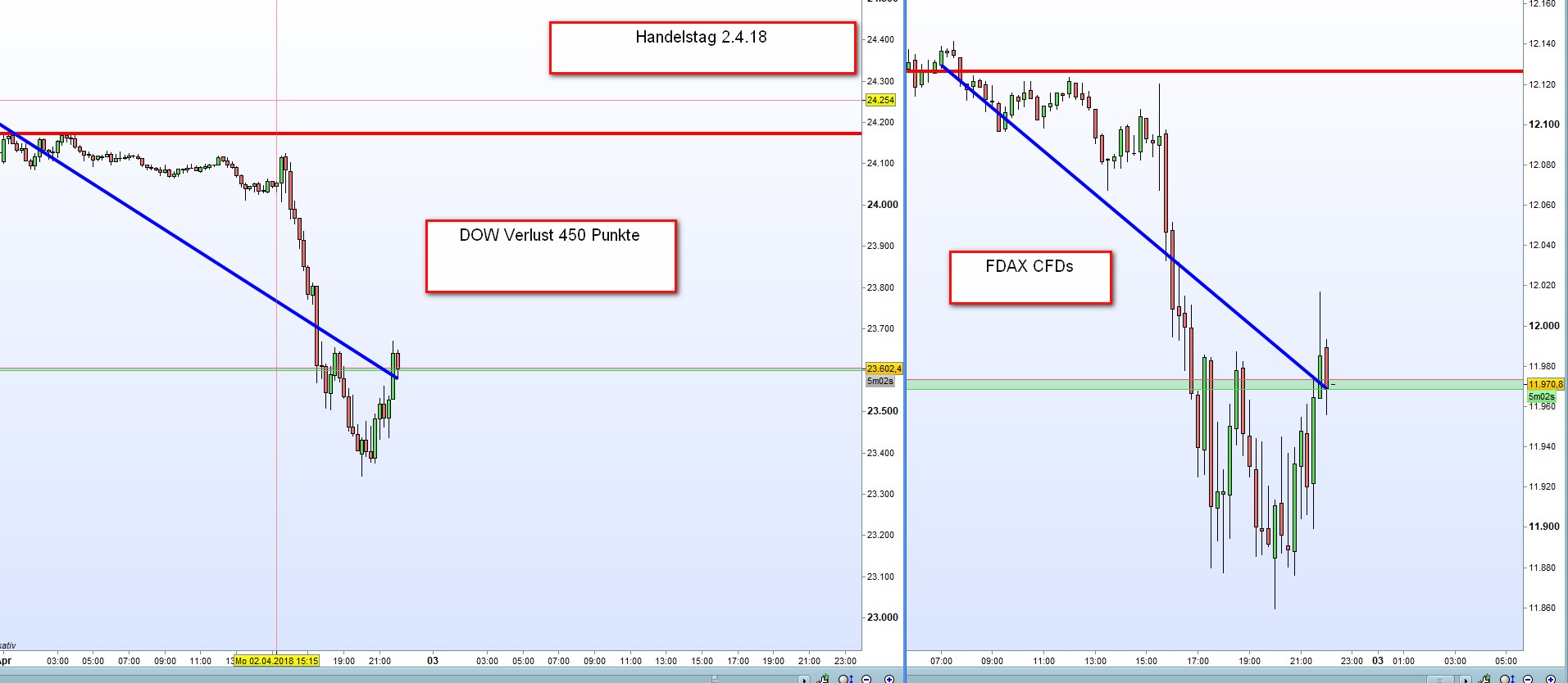 Sie kommen immer wieder vor und wir können sie nicht ignorieren. Für den systematischen Handelsansatz bedeuten Trendtage in der Regel Verluste. In der FDAX-TRADING-STRATEGIE werden sie beschrieben und wir handeln mit dem Trend. Trendtage haben kein Geheimnis und sind meistens charttechnisch zu erklären. Plötzliche Ereignisse sind jedoch unvorhersehbar. Der gestrige Handelstag wurde gut dargestellt und, wie fast immer, bestimmt die US Börse, für uns der DOW, die FDAX Kursbewegung.