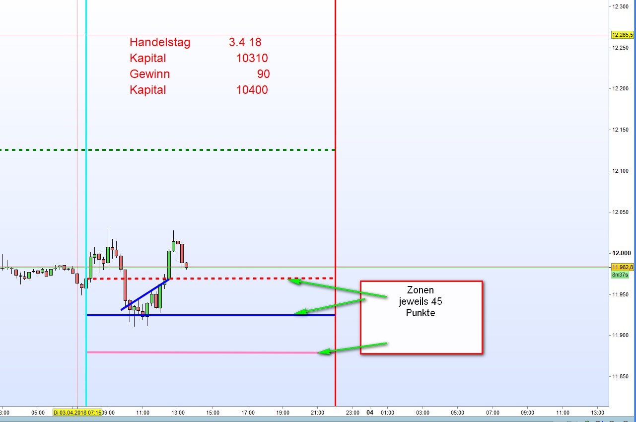 Für den systematischen Handelsansatz wurden bisher Gaps, ausser Doppelgaps vernachlässigt. Gap Trading erfordert erhöhte Aufmerksamkeit und flinker Handel der den meisten Marktteilnehmer nicht liegt. Es gibt jedoch Handelstage mit weiten Gaps diese aber trotzdem nicht den Anforderungen einer Doppel Gap erfüllen. Sofern diese Gaps über 80 Punkte ausmachen werden wir diese in das Regelwerk wie folgt mit aufnehmen: Zur Schließung der Gap erfolgt ein Einstieg erst an der Zweiten Zone, diese wird dann die erste Zone und zwar mit einem TP von dem jeweiligen Zonenabstand. Diese Gaps nennen wir Wide Gap. Angefügt Chart einer Wide Gap und Doppel Gap. Beide aus der vergangenen Handelswoche. -