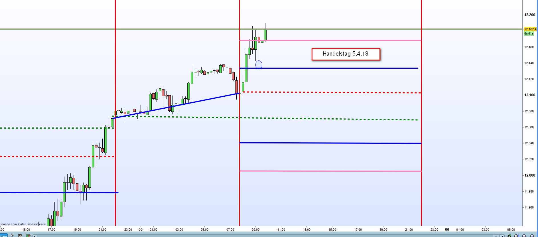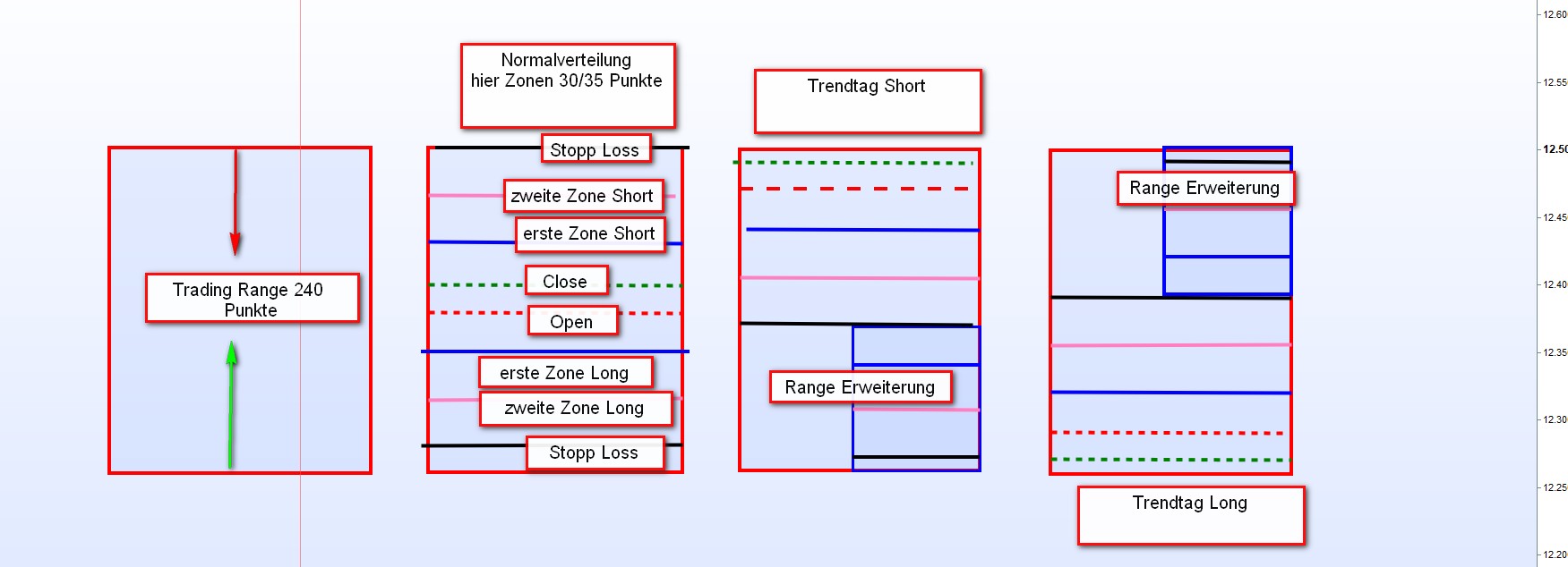 Richtung von 20 Punkten + eröffnet. Insgesamt mindestens +40 Punkte. Sofortiger Einstieg in Richtung Gapschließung wenn DJIA Fut nicht über +30 Punkten notieren. Ansonsten mit erster signifikanter Umkehrkerze und Überprüfung ob sich ein Trendtag abzeichnet.Invers für Short.