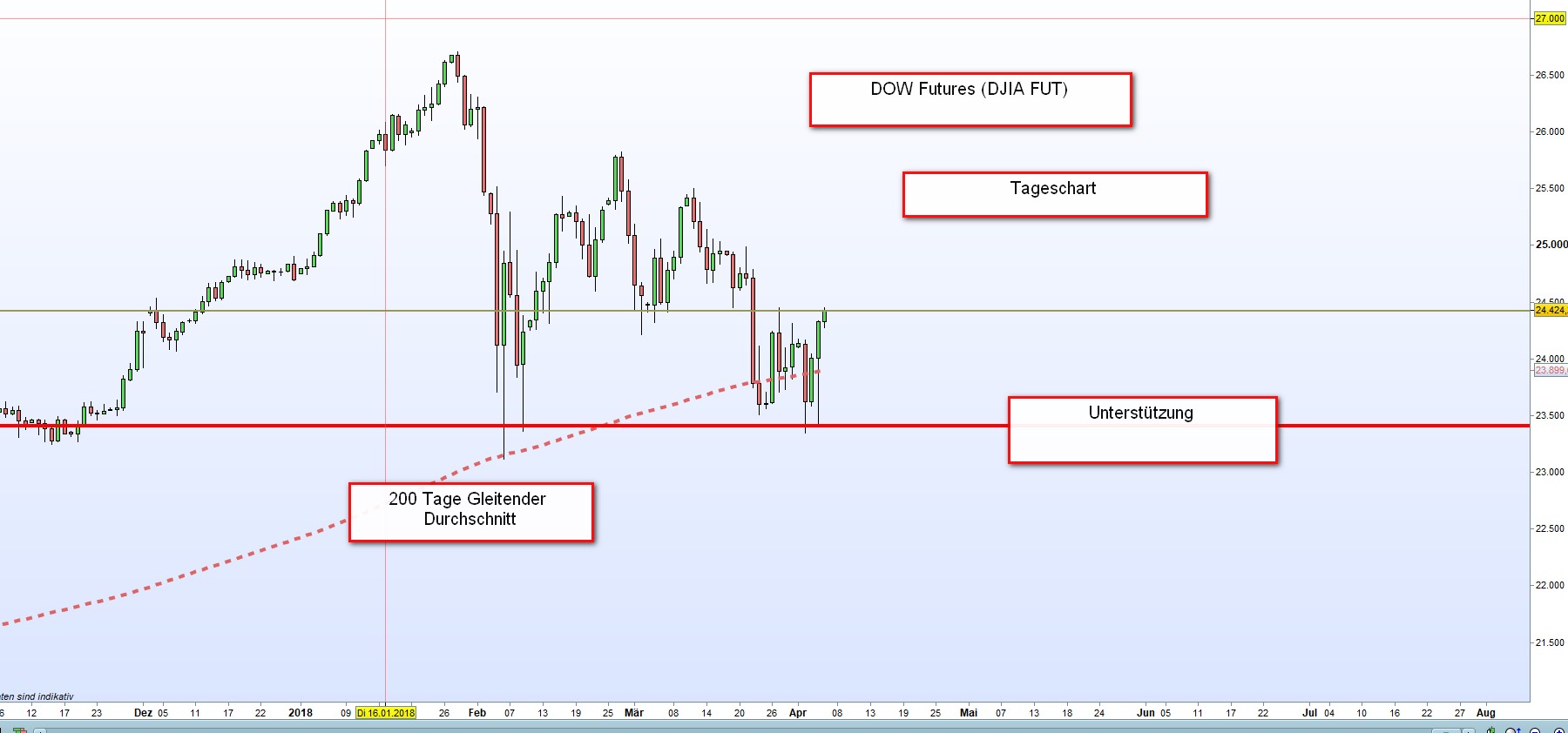 Betrachten wir den eingefügten Tageschart der DJIA FUT. Der Kurs wurde bis zur Unterstützung gehandelt und schnellte nach oben. Diese Unterstützung alleine ist noch keine Garantie jedoch spielen die aktuellen Katalysatoren die tragende Rolle. Handelskrieg heißt der Katalysator zur Zeit. Gestern traten viele US Regierungsmitglieder mit beschwichtigenden Statements zu dem Thema auf den Plan und schon begann die Erholungs Rallye. Morgen werden um 14:30h die US monatlichen Arbeitslosen Zahlen veröffentlicht. Eine der wichtigsten Veröffentlichungen im Monat. Bis dahin gilt es: Buy The Dips. Trotzdem, immer wieder Stopp Loss im vernünftigen Abstand setzen. -