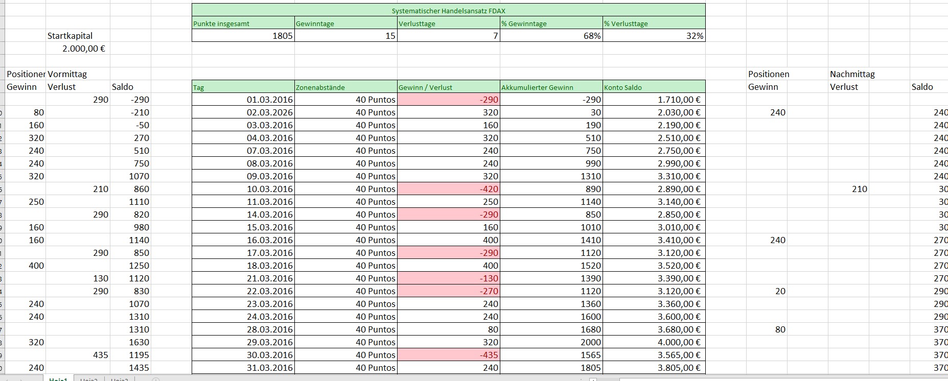 Links in der Tabelle sind die Ergebnisse der Positionen die von 8h bis 14:30h eröffnet wurden. Rechts die Ergebnisse ab 14:30h bis 22h. Ab dem 30 März wurden die CFD Stückzahlen von 2 und 4 auf 3 und 6 erhöht. Werde in Zukunft jeden aufgearbeiteten Monat fortlaufend hier veröffentlichen.Dieser Beitrag wurde bereits 1 mal editiert, zuletzt von „GeorgM“ ()