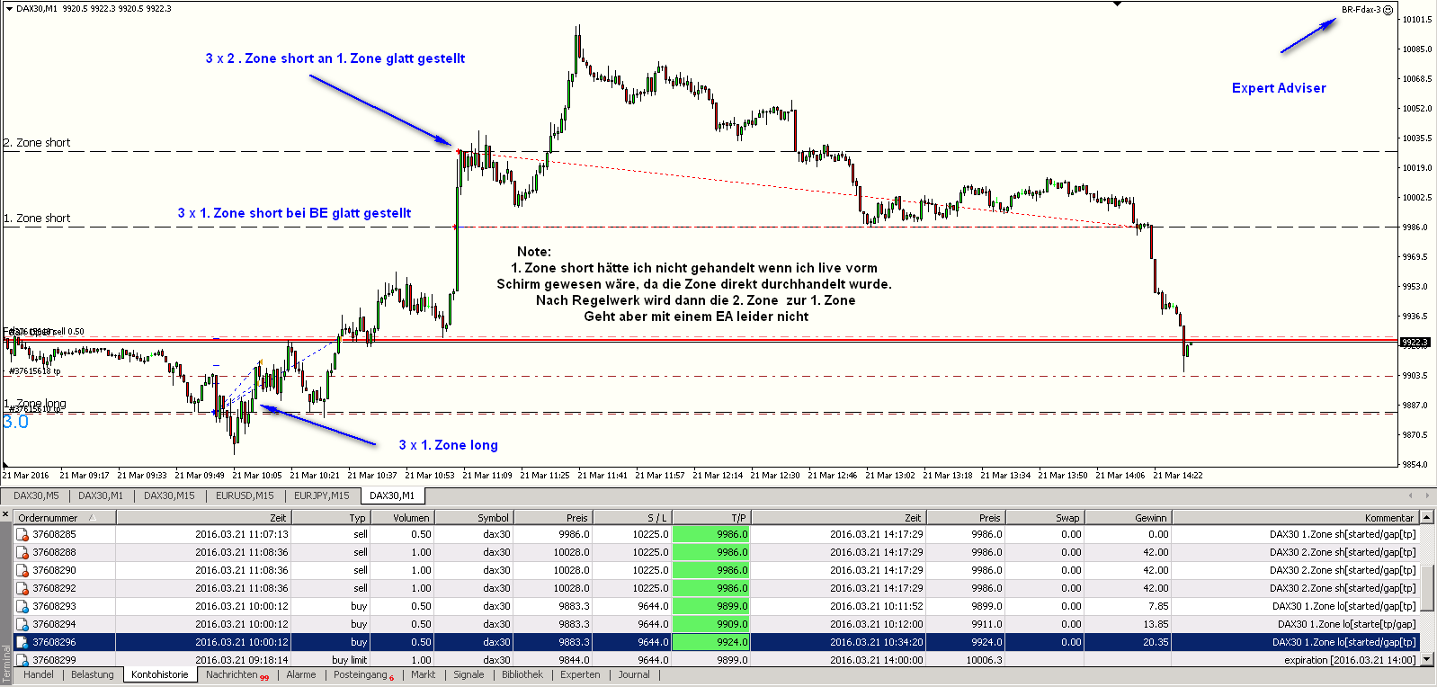 Der Nachteil beim EA is,t dass er nicht bei Bedarf, so wie heute, die 2. Zone zur 1. Zone befördert. Manuell wäre ich nicht an der 1. Zone short gegangen da diese überrannt wurde. Habe bei BE an 1. Zone alles glatt gestellt. " Einer bleibt drin habe ich bewusst nicht gemacht "