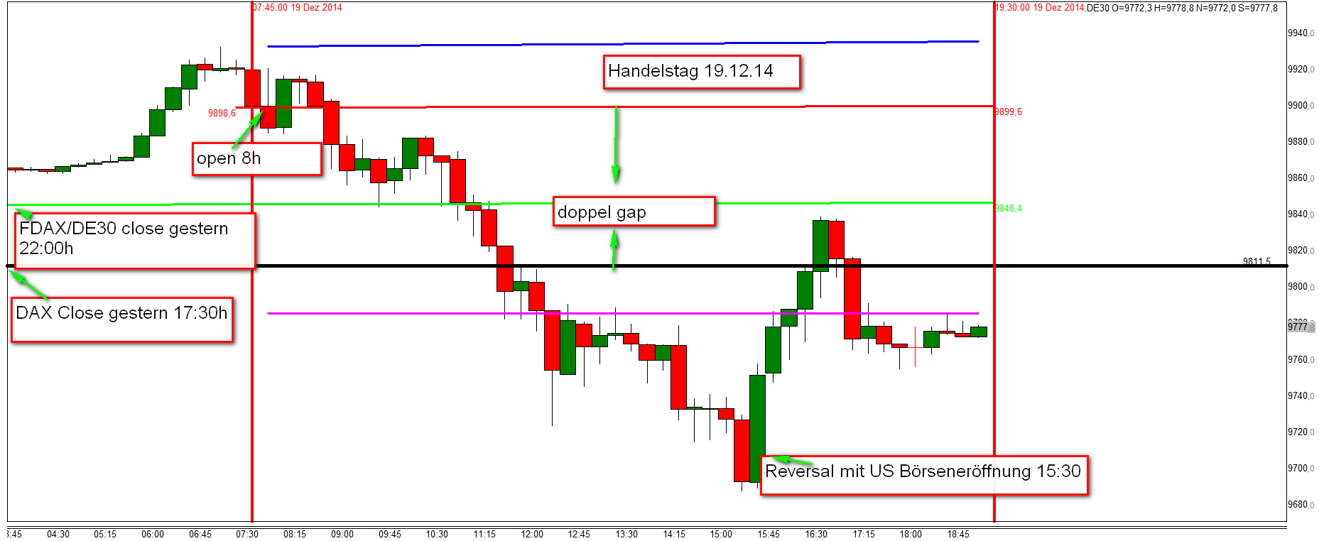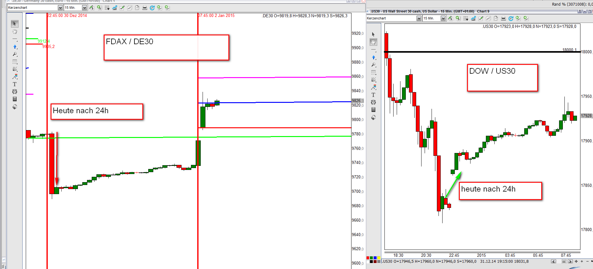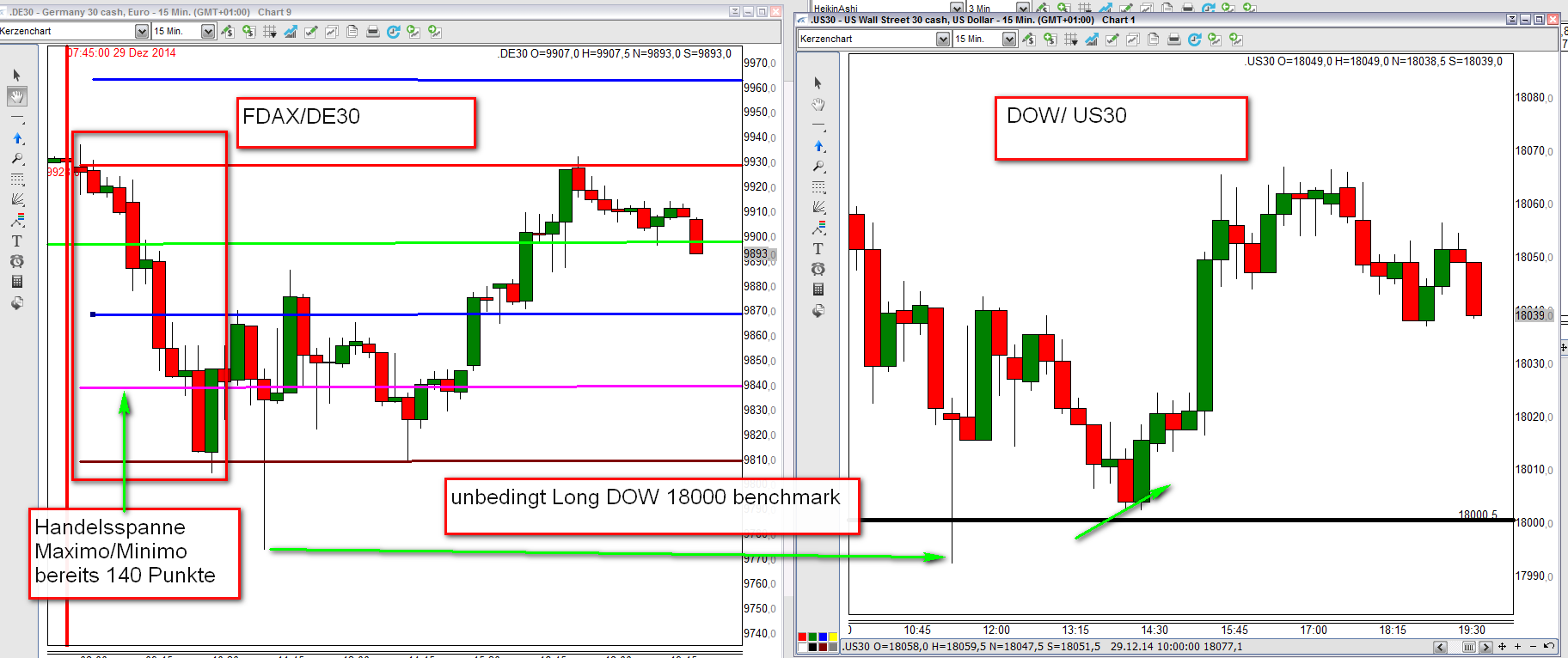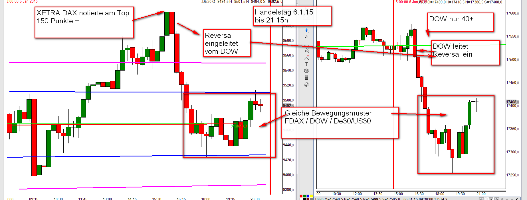 Werde in den kommenden Wochen das Regelwerk up to date zusammenfassen. Außer den Regeln liegt der Schwerpunkt auf der Korrelation DOW/DAX . Habe mich intensiv mit dem Thema beschäftigt und es ist der Knackpunkt für das Verständnis der täglichen Trading Range. Insbesondere folgt der FDAX nachmittags weitestgehend den DJIA FUT . Bei Analyse der eingefügten Charts ist zu erkennen, dass um 16:15h eine erhebliche negative Korrelation DOW/DAX vorlag. Das Ergebnis war, dass der DAX nach Reversal DOW am nachfolgenden Bewegungstief 180 Punkte nachgab.