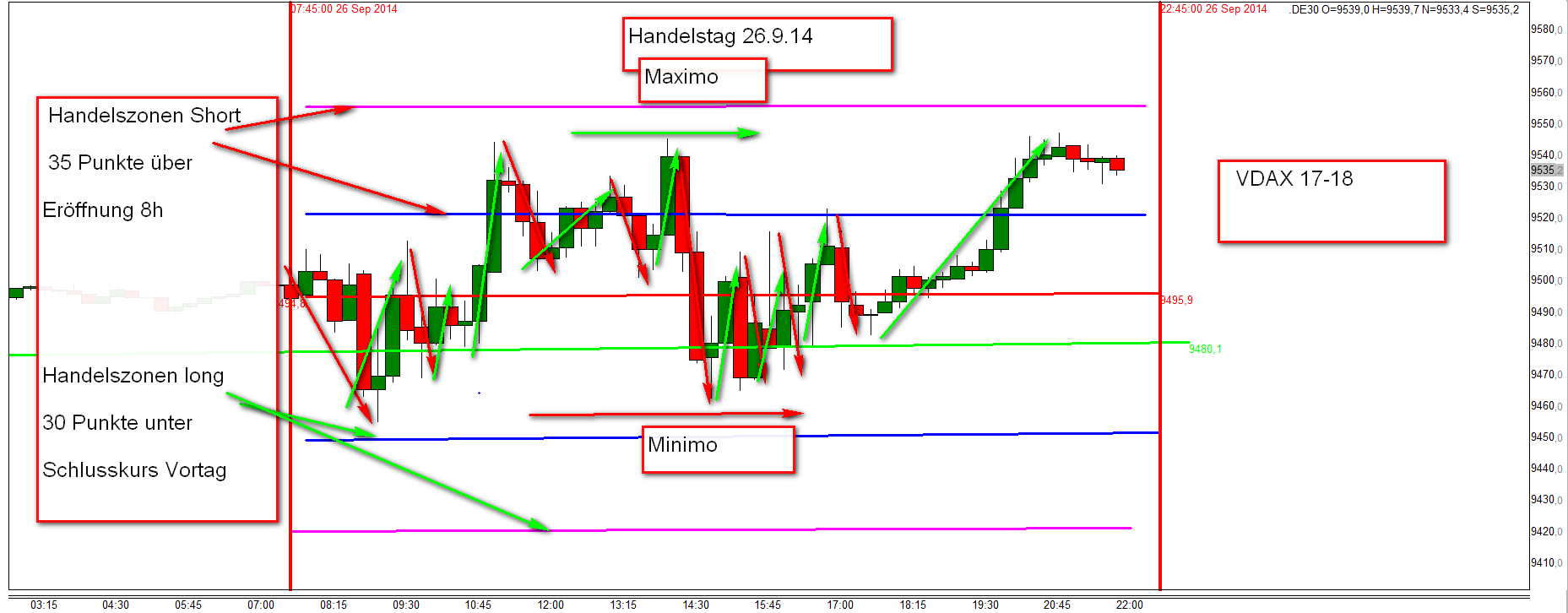 Zum Gelingen gehören bestimmte Voraussetzungen, die noch dokumentiert werden. Eine der wichtigsten Voraussetzungen ist die Berücksichtigung der vorherrschenden Vola ( VDAX). Mit Kenntnis des Schlusskurses vom Vorhandelstag um 22h und Eröffnungskurs um 8h wird ein Handelsgerüst erstellt welches der Vola angepasst wird.