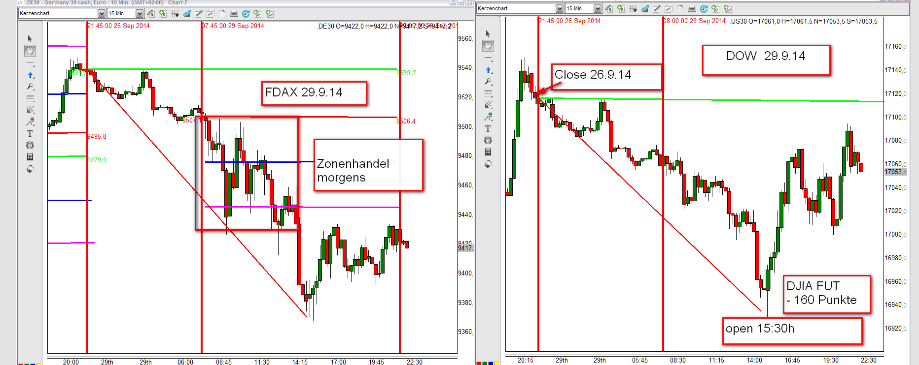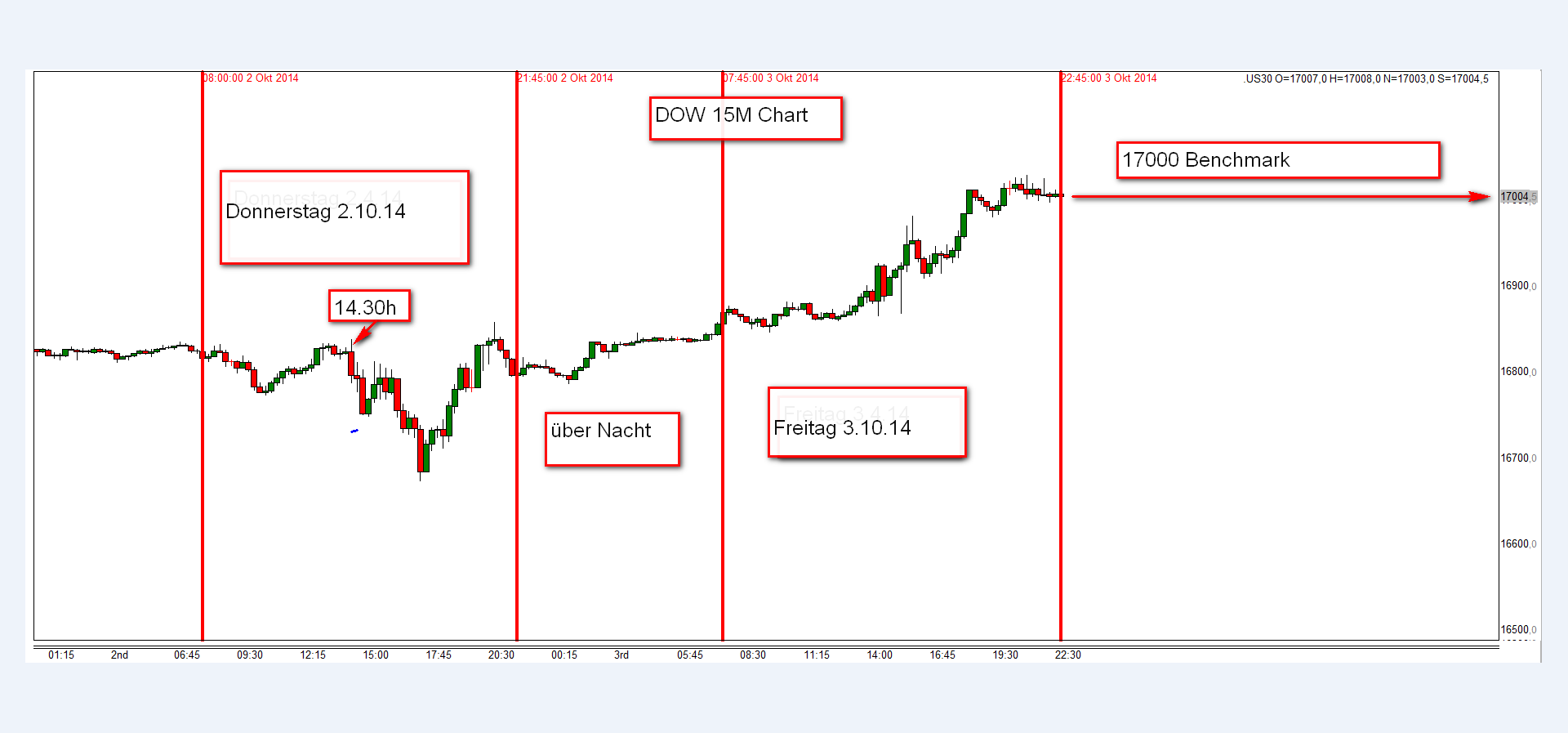 Angehängt 15M Charts für FDAX/ German 30 und DOW/US30 ab Donnerstag 2.10.14 bis Freitag den 3.10.14 22h. Ab 14:30 hat der DOW vollständig das Kommando übernommen. Das gilt insbesondere über nacht und für den Freitag. EUREX war zwar geschlossen, aber der CFD Broker hat mit einem erweiterten Spread den Kurs vom FDAX nach den DOW Vorgaben taxiert wenn auch ab 17:30h nicht mit dem selben Aufwärtsimpuls. Wie bereist letzte Woche angemerkt, lieben es die institutionellen Marktteilnehmer in den USA freitags den Kurs mit einem plus zu schließen, wobei zur Zeit 17000 für den DOW eine wichtige Benchmark ist.