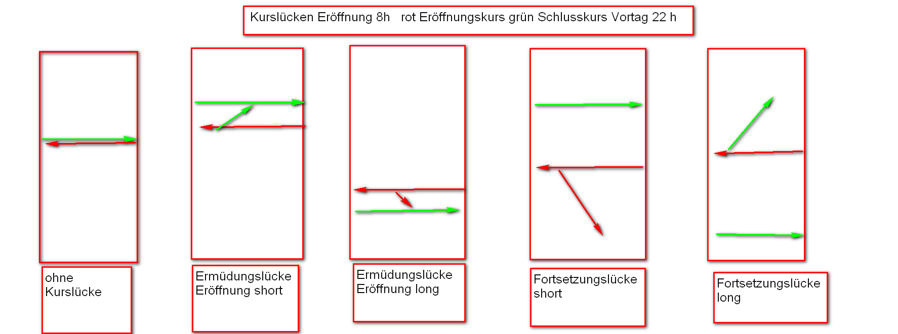 Bei den Notierungslücken nach Eröffnung um 8:00h MEZ handelt es sich meistens um Erschöpfungsgaps (Exhaustion Gaps) die im Verlauf des Handelstages geschlossen werden, seltener um Fortsetzungsgaps (Continuation Gaps) die Intraday offen bleiben. Je enger die Gaps um so höher die Wahrscheinlichkeit der Schließung. Bei sehr weiten Gaps kommt es eher zu einer Kursfortsetzung in Richtung Eröffungskurs.