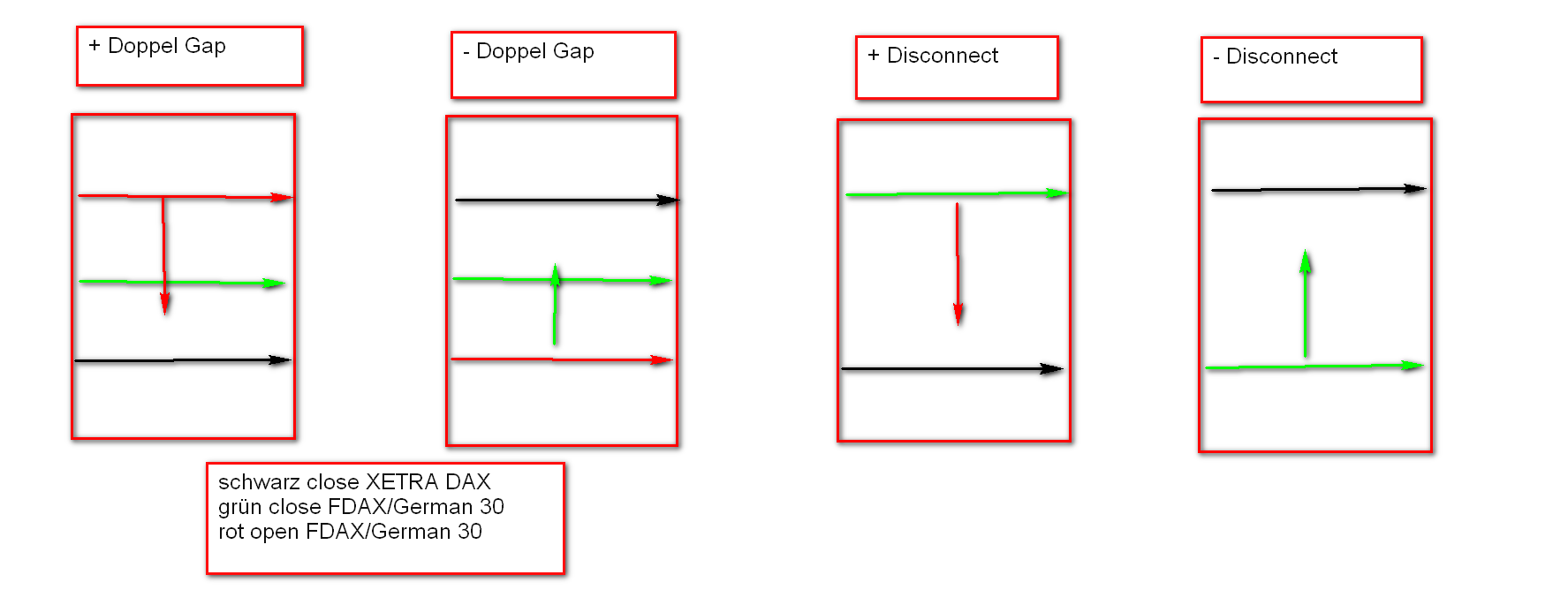 Dieses Kursmuster kann nach Schließung XETRA-DAX um 17:30h nur von den DJIA FUT und in der Regel bei erhöhter Volatilität herbeigeführt werden. Heftige Kursbewegungen von 17:30h bis 22h verursachen zuweilen eine +/- Kursdifferenz zum DAX von über 70 Punkten. Bei einem bullischen Umfeld und - Disconnect kann man dann, mit Absicherung von 30 Punkten, eine longposition über Nacht halten. Invers bei einem bärischen Umfeld und + Disconnect.