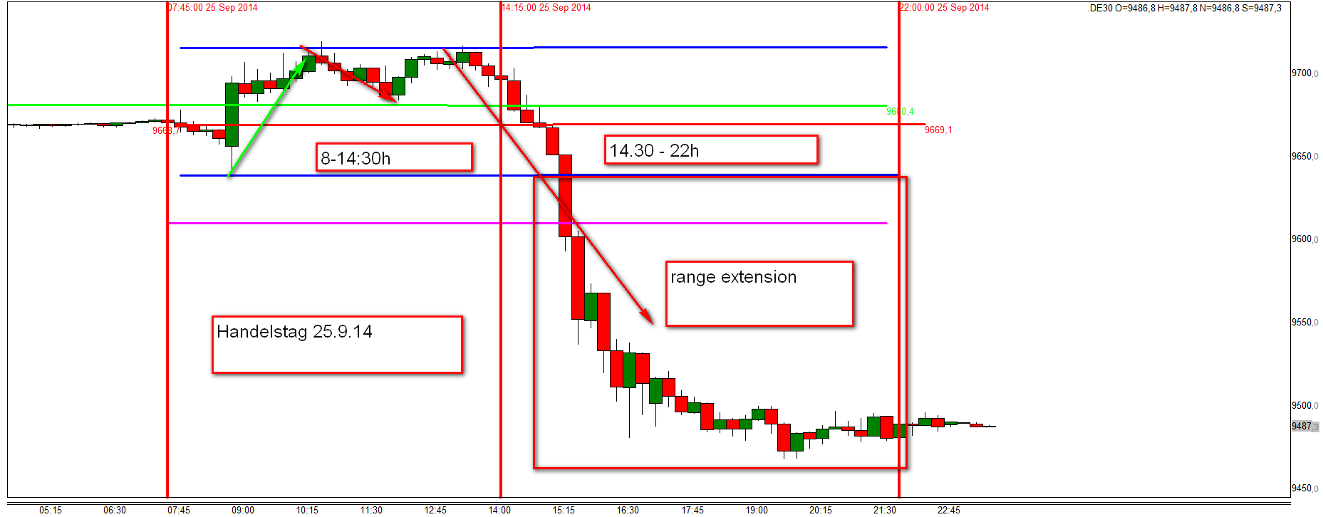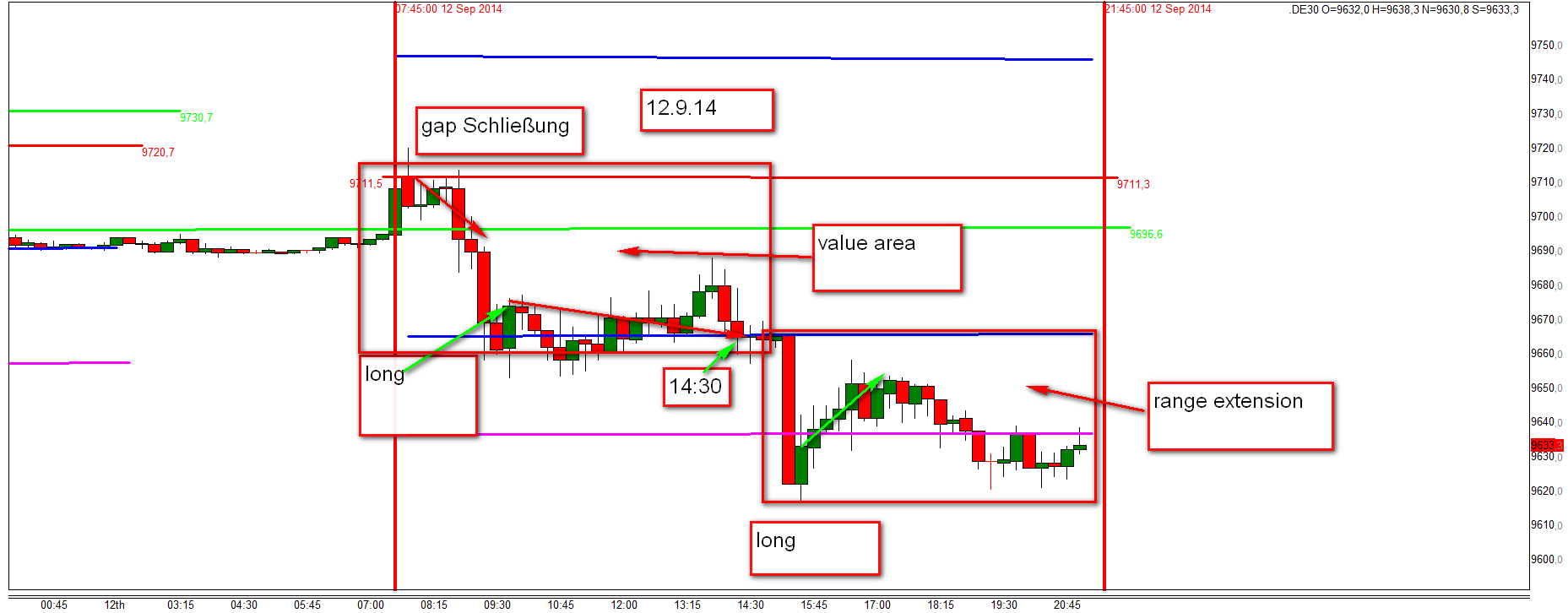 Nur wenige Handelstage haben bis 14:30h ihre Tradingspanne ausgeschöpft. Um 14:30h und um 16:00h MEZ werden eine Serie von US Wirtschafts- und Konjunkturdaten veröffentlicht die zu einer Rangeerweiterung führen könen. In Anlehnung an das Market Profile von Peter Steidlmayer wird die dann aktuelle FDAX-Tagesrange als angenommene Value Area im Chart eingezeichnet. Gehandelt werden Korrekturen(Reversals) außerhalb oder an den Rändern der Value Area eingeleitet durch eine signifikante Umkehrkerze. Im heutigen Chart wird die range extension dargestellt.