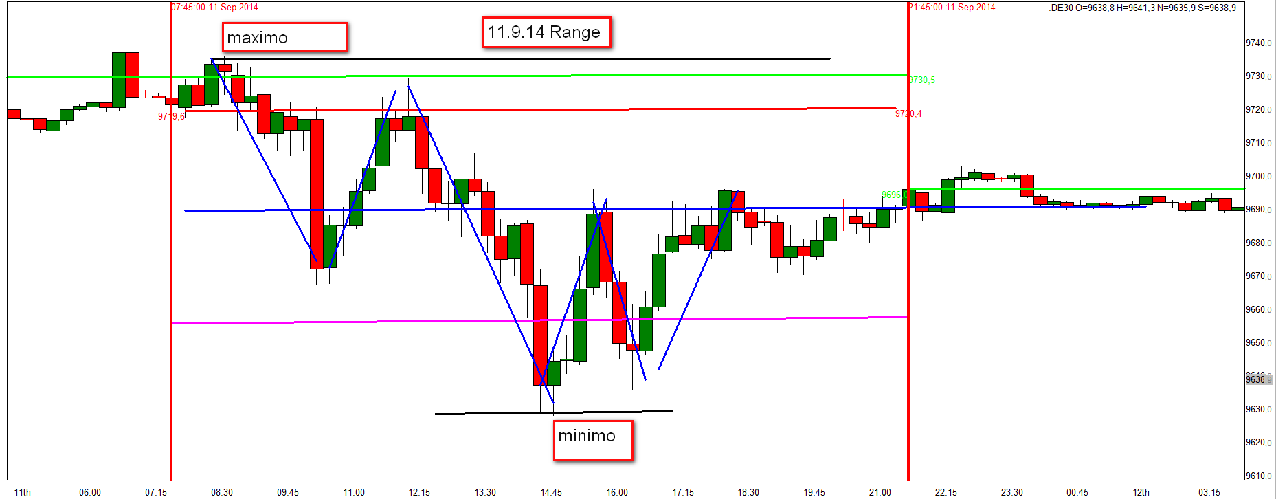 Betrachten wir den eingefügten Chart vom 11.9.14. Bei einer sehr niedrigen Vola betrug die Normalverteilung Maximo - Minimo 100 Punkte. Die größeren Kursbewegungen jedoch insgesamt 400 Punkte +!!!