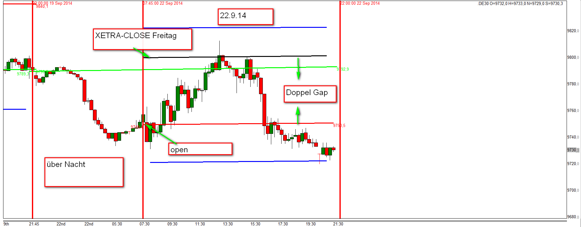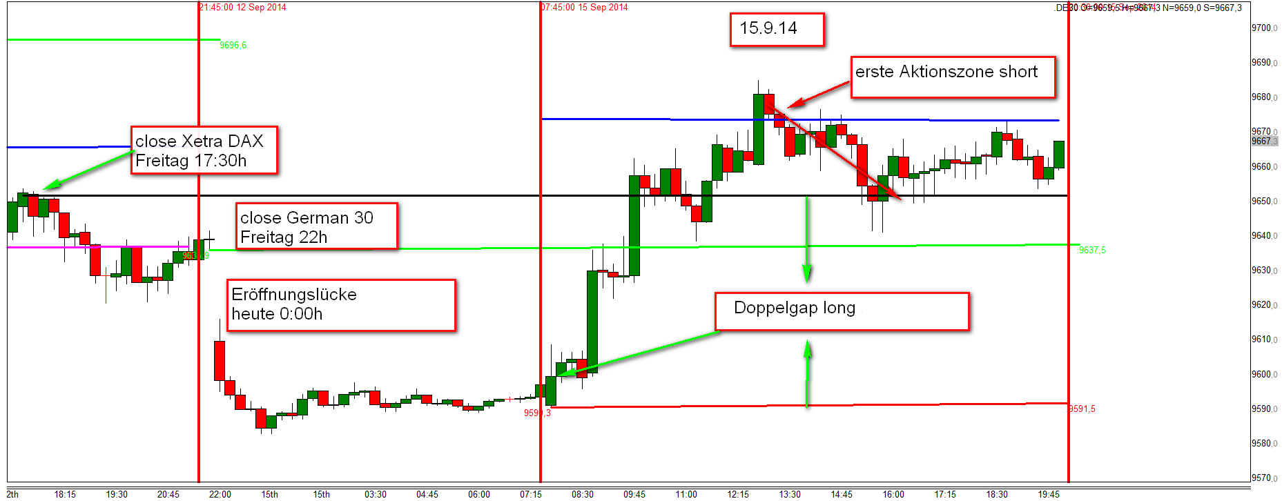 Eine Doppelgap liegt vor wenn der FDAX/DE30 um 22:00h mindestens 20 Punkte über/unter dem Schlusskurs XETRA-DAX notiert und nach Eröffnung am Folgetag mit einer Gap in gleicher Richtung von 20 Punkten +/- eröffnet. Insgesamt mindestens +/-40 Punkte. Nach Eröffnung Einstieg mit einer Umkehrkerze (Reversal) in Richtung Gapschließung mit einem Gewinnziel von 30-40 Punkten. Tendiert nach Einstieg der Kurs in den Verlust dann wird an der ersten Aktionszone- die dann als zweite eingestuft wird- der Einsatz verdoppelt und mit dem Zeitstopp abgesichert.