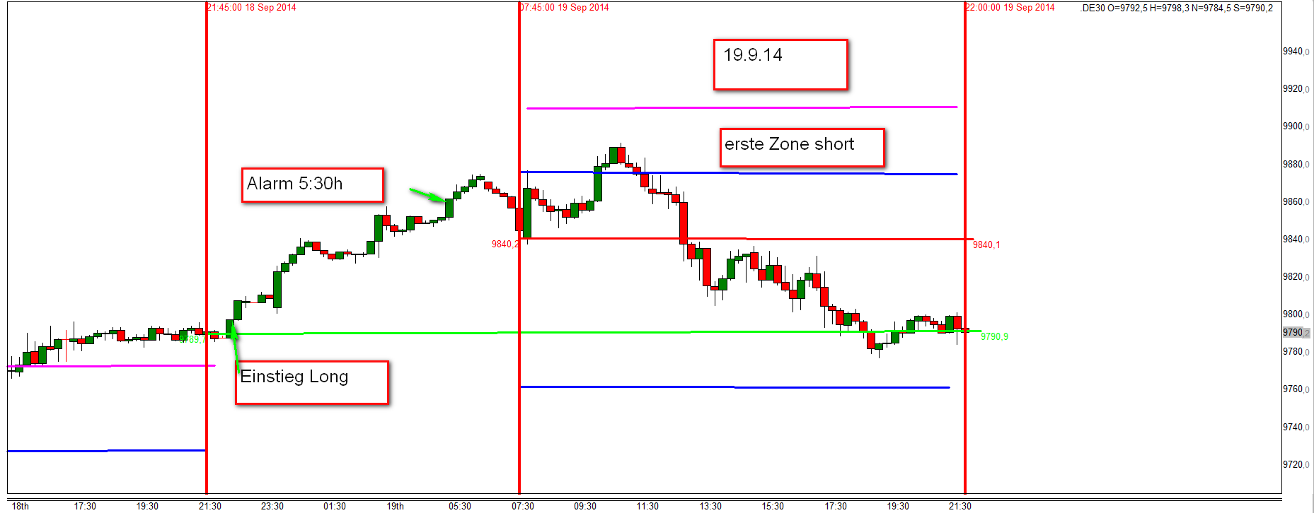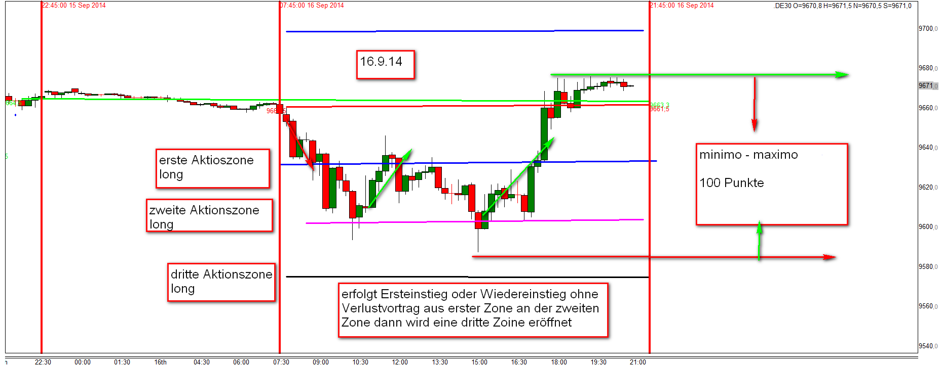 Nach 14:30h bzw. USA Börseneröffnung um 15:30h werden Positionen an den Aktionszonen eröffnet wenn der Kurs von oben oder unten die Zonen durch handelt. Das schließt auch eine 15M Kerze ein die zunächst über die Zonen hinaus gehandelt wurde und dann innerhalb der Zonen schließt. Der Handel unter die Zonen hinaus (für Short) mit anschließendem Schlusskurs innerhalb der Zonen sollte charttechnisch signifikant sein. Wird nachmittags zunächst die zweite Aktionszone durch gehandelt und somit eine Position eröffnet dann wird zum gleichen Abstand eine dritte Aktionszone aktiviert. Einstieg jedoch mit doppelter Anzahl von Kontrakten und Time Stop wie bereits erklärt.