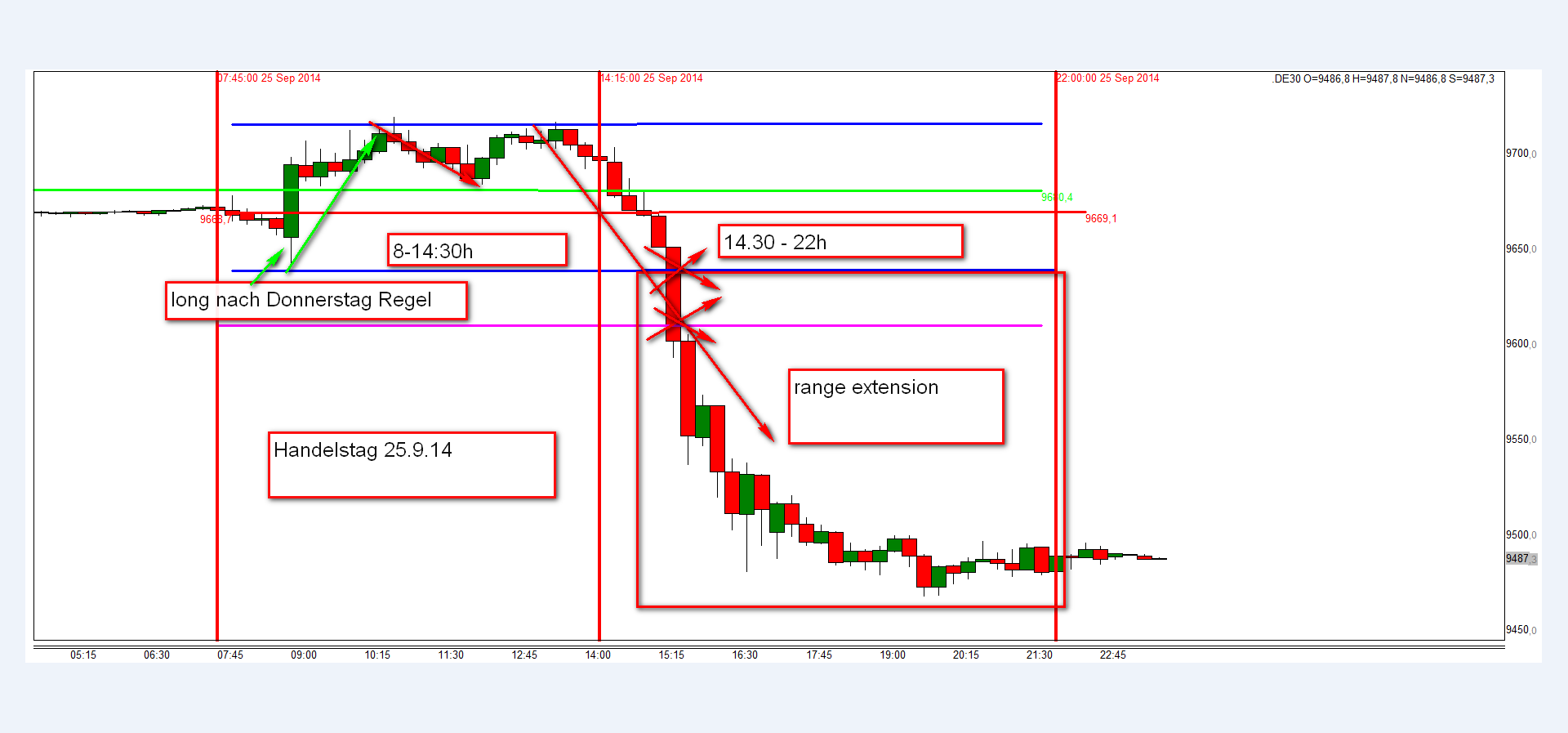 In dem Chart werden die Bewegungen vormittags und nachmittags mir eine range extension dokumentiert. Donnerstags werden gemäß dem Regelwerk anfänglich Long-Trades eröffnet . Der Einstiege Short erfolgen nach dem Scale Out Verfahren, das heißt, dass eine Teilorder laufen gelassen wird und zwar bis zur nächsten signifikanten Umkehrkerze. An den Aktionszonen Long wurden nachmittags keine Positionen eröffnet, weil der Kurs die Aktionslinie nicht von unten nach oben durchhandelte. Alles wurde bereits ausführlich in diesem Thread beschrieben.