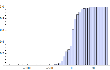 Das Histogramm der kumulierten Verteilungsfunktion zeigt, dass sich der neutrale 50 %-Wert (wo die Strategie mit einigem Aufwand weder Gewinn noch Verlust erzielt) sehr nahe bei Null befindet. Die Quantile (also der Prozentsätze) liegen für 25 % der Trades lieg bei -70, 50 % genau bei 0, 75 % bei 72. Die Trennschärfe des Regelwerks ist also trotz seiner Komplexität gering.