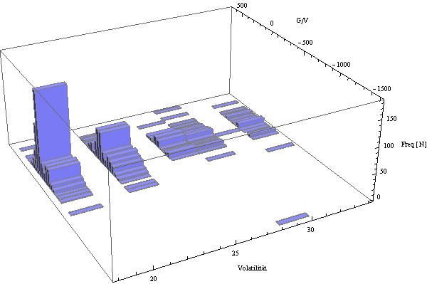 Eine 3-dimensionale Aufteilung der gesamten Verteilung auf die unterschiedlichen von Georg gewählten Vola-Stufen stellt das detaillierter dar, wobei für die höheren Vola-Werte für eine qualifizierte Aussage nicht genug Daten vorhanden sind.
