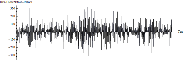 Die täglichen Renditen zeigen die typische Clusterbildung auch anderer Rendite-Untersuchungen und unterscheiden sich recht auffällig von normalverteilten Random-Daten.