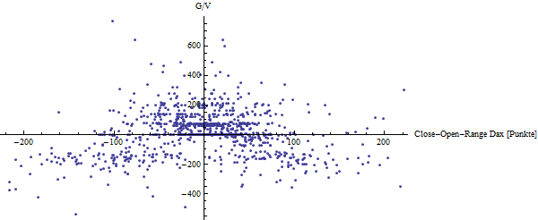 Besonders interessant ist die Verteilung der Gewinne und Verluste in Abhängigkeit des DAX-Range Close - Open. Krümel meinte, dass die großen Verluste vorrangig in den High-Range-Tagen auftreten. Ich füge hinzu, dass es ziemlich erstaunlich ist, dass auch an Tagen geringer DAX-Ranges tüchtige Gewinne und Verluste auftreten. Dazu wäre eine Erklärung von Georg nicht schlecht.