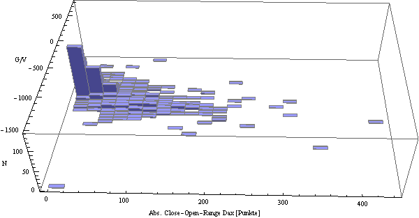 Im 3D-Plot der Gewinne und Verluste gegen den Absolutwert des DAX-Ranges Abs(Close - Open) kann man sehen, dass die meisten Trades moderate Auswirkungen haben, die wenigen weiten Ausreißer jedoch ein höchst unerwünschtes, nicht eliminiertes, großes zufälliges Element in der Strategie belassen.