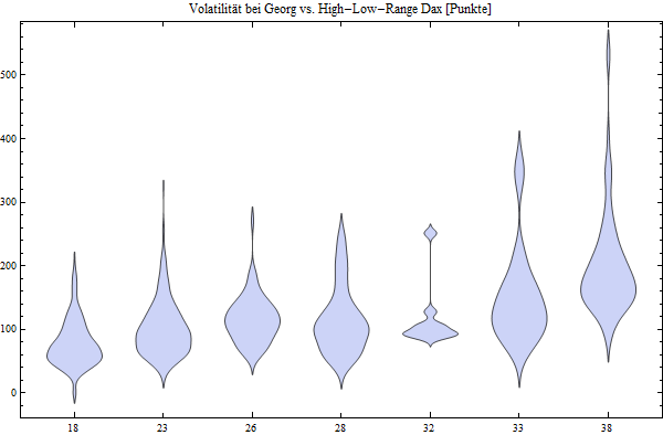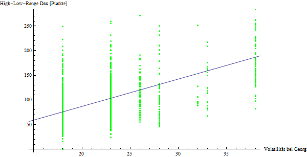 Allerdings ist die Varianz sehr groß, so dass die reale Eignung von Georgs Maß für die dann wirklich folgende Vola des DAX zu hinterfragen ist, wobei allerdings das brauchbare Vorhersehen der Vola auch eine theoretisch sehr schwierige Angelegenheit ist.