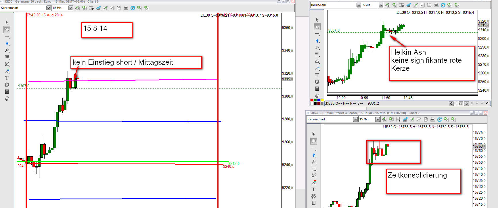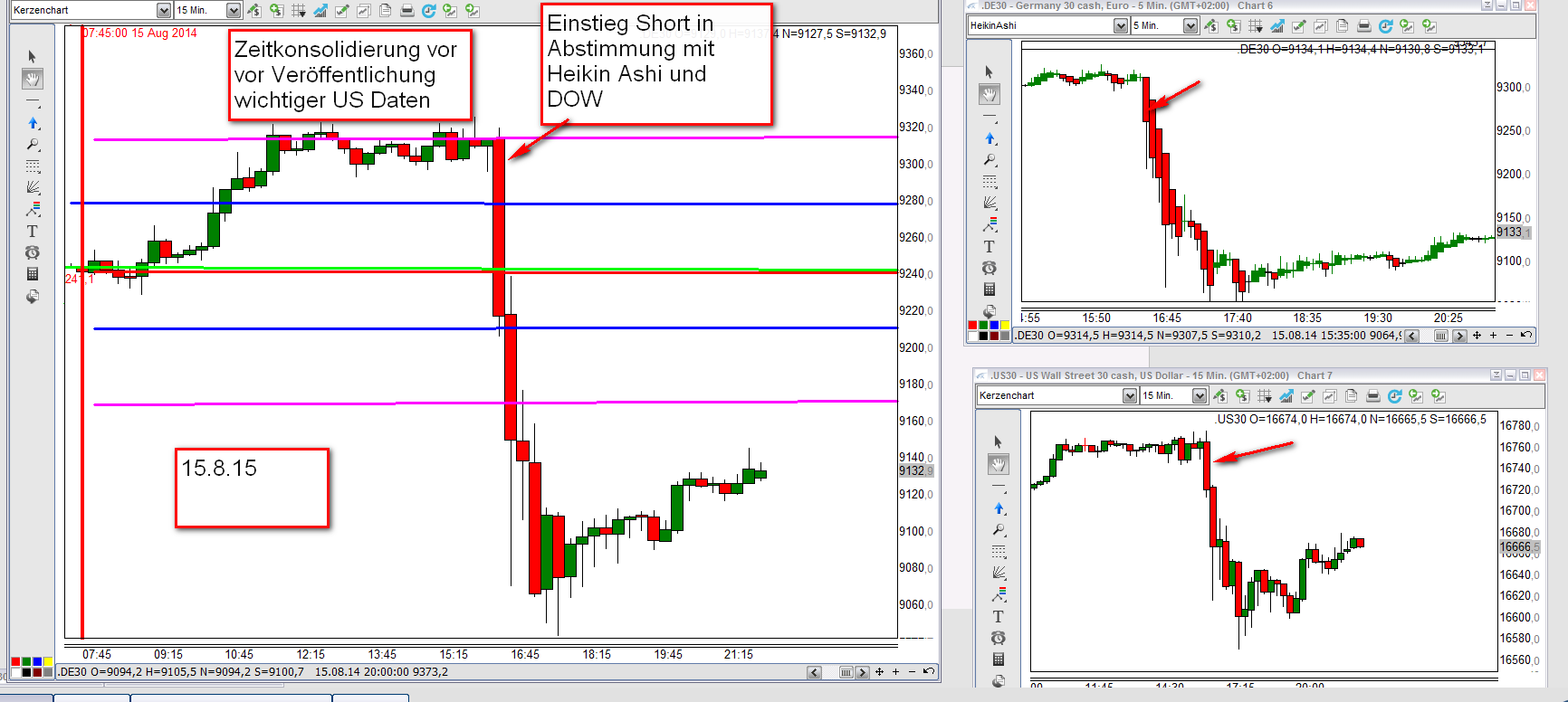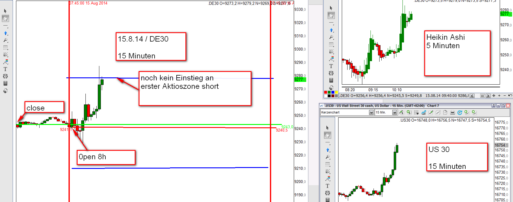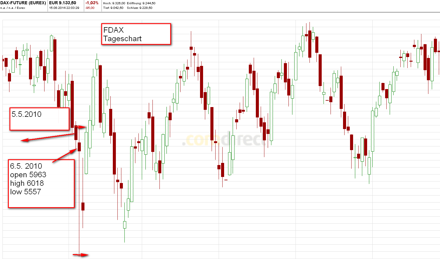 Als Beispiel nehmen wir den flash crash vom 6. Mai 2010 mit einem in der Tabelle ausgewiesen Verlust von 1469€. In Wirklichlichkeit wären durch Einstieg short an der ersten Aktionszone short und scale out hohe Gewinne erzielt worden. Angefügt Tageschart FDAX vom 6.Mai 2010. Weiterhin 3 Charts vom letzten Handelstag 15.8.14. Zwei Charts wurde für mein Archiv live erstellt und der dritte aufgrund der heftigen Bewegung später.
