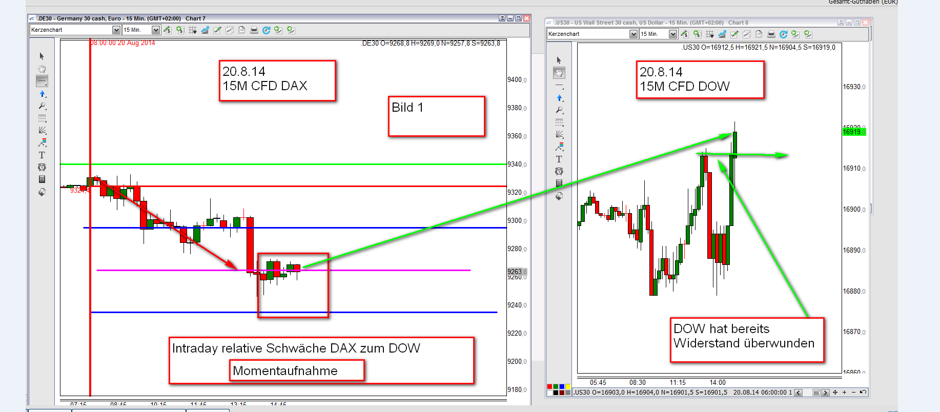 Nehme immer wieder Bezug auf die Korrelation DAX/DOW und den Handel von Daxpositionen in Übereinstimmung mit dem DOW. Bei der Korrelation kommt es zeitweise zur wechselseitigen relativen Schwäche / Stärke sowohl im übergeordneten Zeitfenster als auch im Daytrading. Bei täglicher uneinheitlicher Notierung der 3 US Majors ( DOW, Nasdaq und S&P500 ) wird in der Regel der DAX dem DOW folgen. Die Eröffnung des FDAX um 8h erfolgt in Übereinstimmung der Notierung der DJIA FUT über Nacht. Bis 12h hat der der FDAX durchaus ein Eigenleben und zwar dergestalt das die Kursbewegungen heftiger sind. Nach 14:30 USA Vorbörse und Eröffnung um 15:30h bis 22h bestimmen allerdings de DJIA FUT die Bewegungen des FDAX. Ich darf hier mit Fug und Recht behaupten, dass ich mit dieser Bewegungsdynamik beschäftigt habe wie kaum ein Zweiter und beim Handel daraus Nutzen ziehe. Betrachten wir die eingefügten Charts CFD/ DAX und CFD/DOW.