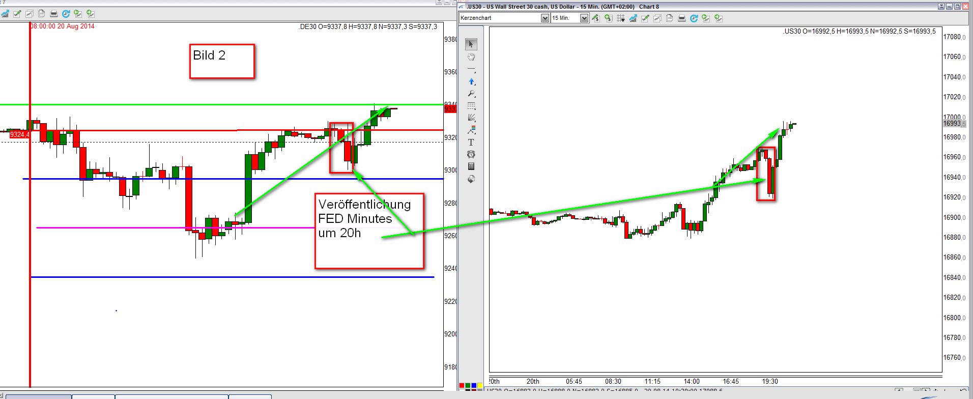 Im Vorfeld wichtiger Veröffentlichungen wie US Arbeitsmarktdaten und FED-Entscheidungen kommt es in einem bullischen Umfeld regelmäßig zu Kursgewinnen. Die Arbeitslosenquote wird am ersten Freitag des Monats und die Erstanträge auf Arbeitslosenhilfe wöchentlich donnerstags um 14:30h MEZ veröffentlicht. Das Federal Open Market Committee trifft sich regulär acht Mal in einem Kalenderjahr. Weiterhin sind die Sitzungen und deren Ergebnismitteilungen der EZB von besonderer Wichtigkeit. Der Einstieg in eine Long-Position ist an solchen Tagen nicht zwingend an eine Regel gebunden. Es ist durchaus möglich, dass morgens der FDAX zunächst fällt und dann aber spätestens gegen Mittag steigt. Der Anstieg ist keineswegs linear und Zonenhandel darf nach Bestätigung stattfinden. In einem bullischen Umfeld hat der DOW die Tendenz freitags, fürs Wochenende, im plus zu schließen.