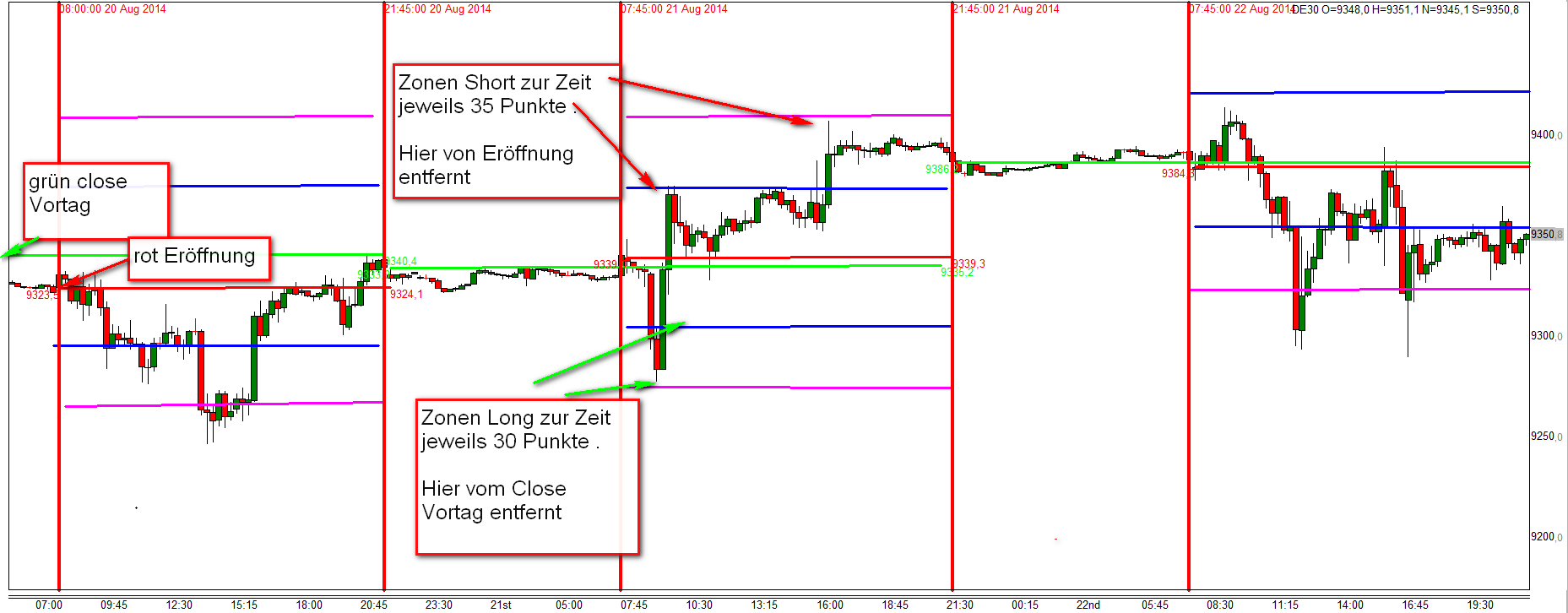 Das Regelwerk hat einen klaren Rahmen und wird Intraday innerhalb der Trading Range effizient eingesetzt. Der gestandene Trader betrachtet die Kursbildung rechts im Chart wie ein Außenstehender und wird aktiv wenn sich Eröffnung und Schließung von Positionen optimal darbieten. Verständnis für price action ohne nachlaufende Indikatoren wird allerdings vorausgesetzt.