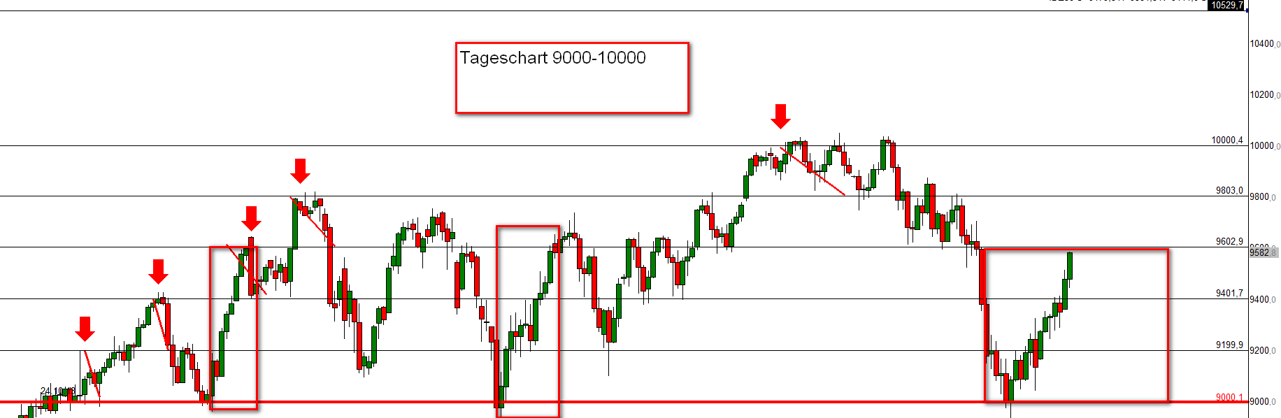 Bei Analyse der langfristigen Charts kann man feststellen, dass neue historische Hochs von jeweils 200 Punkten über dem vorherigen Hoch mit Regelmäßigkeit abverkauft werden. Weiterhin verhält sich der Kurs bei einem Reversal an einer markanten Unterstützung sehr bullish . Voraussetzung fallende Vola onvista.de/index/VDAX-NEW-VOLATILITTS-Index-12105789. Eingefügt Tageschart Kurs 9000-10000.