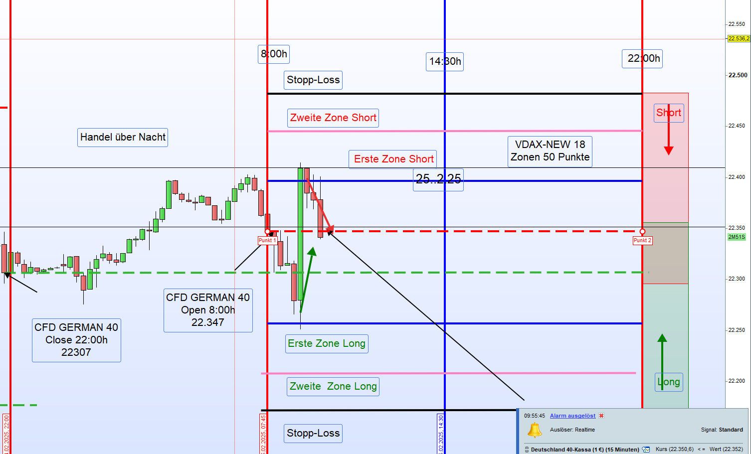 Viele Handelstage haben bis 14:30 Uhr, wenn die US -Vorbörse beginnt, ihre Handelsspanne nicht ausgeschöpft. Zu diesem Zeitpunkt zeichnen wir zunächst die Handelsspanne bis 14:30h als Value-Zone ein. Maßgebend ist ein abgeschlossener 15M Kerzenkörper und nicht der Docht/Schatten.