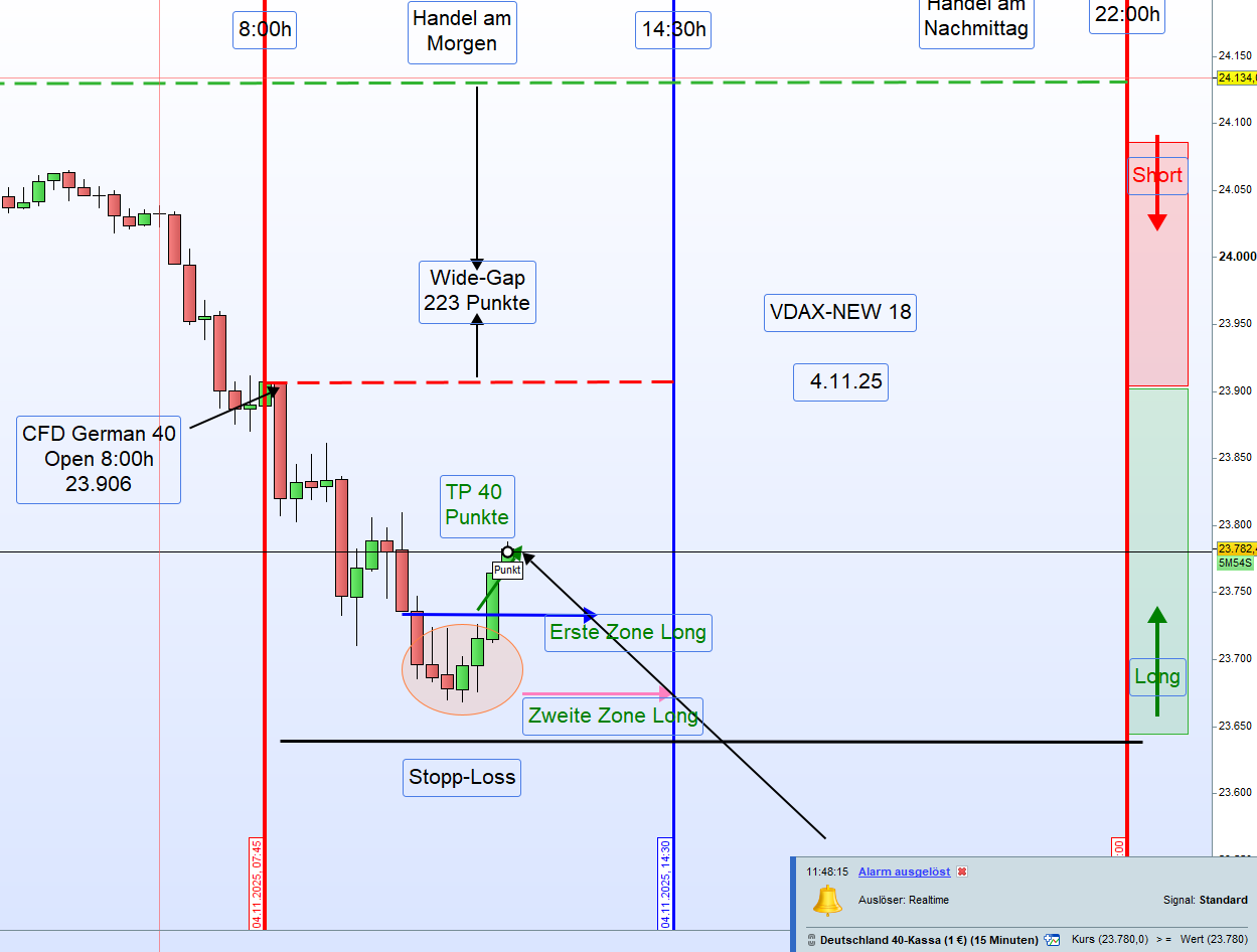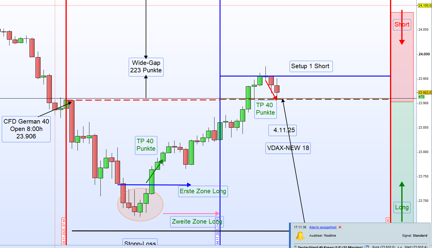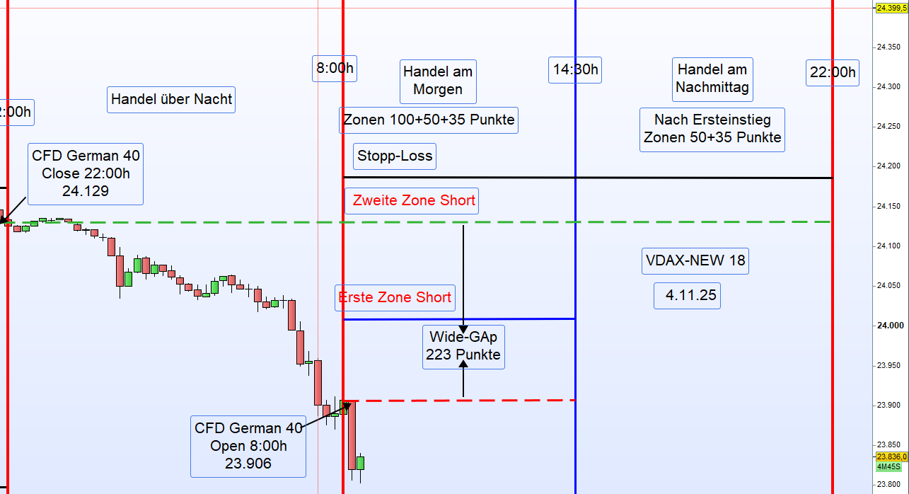 Handelstag 4.11.2025 – German 40Einleitung:Der German 40 schloss am Vortag (3.11.2025) um 22:00 Uhr mit 24 129 Punkten.Heute Morgen, am 4.11.2025 um 8:00 Uhr, eröffnete der Markt bei 23 906 Punkten,was einem starken Down-Gap von 223 Punkten entspricht.Auch die US-CFDs notieren deutlich im Minus,insbesondere der Tech-Index Nasdaq mit einem Rückgang von 1,36 %.Nach der Eröffnung ist der German 40 zunächst um weitere 100 Punkte gefallen.Eine Einteilung der Long-Zonen ist derzeit nicht möglich.Die DAX-Eröffnung um 9:00 Uhr könnte neue Erkenntnisse für einen möglichen Long-Einstieg liefern.⚠️ Handelsempfehlung➡️ ENTHALTUNGBis zur DAX-Eröffnung um 9:00 Uhr keine Long- oder Short-Positionierung. ReferenzkurseZeitpunkt Beschreibung Kurs22:00 (3.11.) Schlusskurs German 40 24 12908:00 (4.11.) Eröffnung German 40 23 906➡️ Down-Gap: −223 Punkte➡️ US-Futures: stark im Minus➡️ Nasdaq: −1,36 %➡️ Marktlage: volatil, abwartend