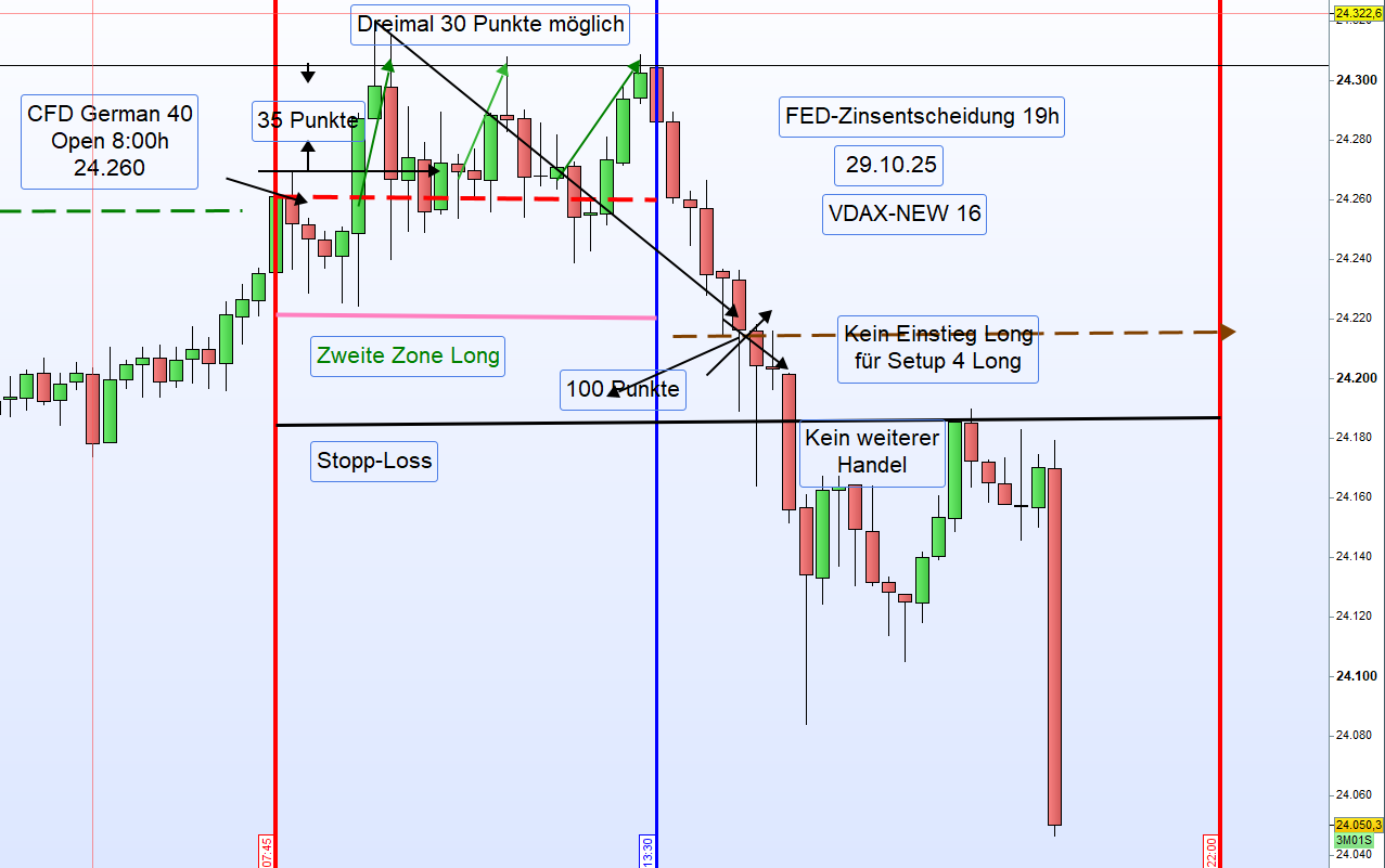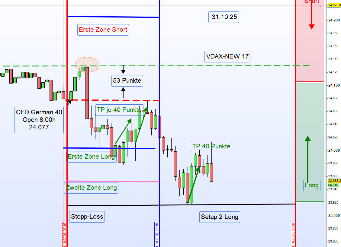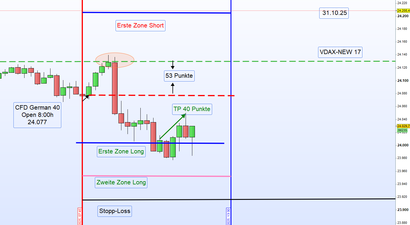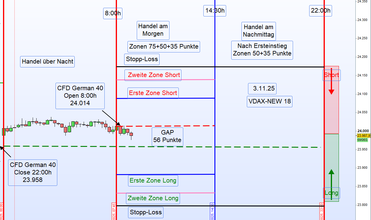 Handelstag 4.11.2025 – German 40Einleitung:Der German 40 schloss am Vortag (3.11.2025) um 22:00 Uhr mit 24 129 Punkten.Heute Morgen, am 4.11.2025 um 8:00 Uhr, eröffnete der Markt bei 23 906 Punkten,was einem starken Down-Gap von 223 Punkten entspricht.Auch die US-CFDs notieren deutlich im Minus,insbesondere der Tech-Index Nasdaq mit einem Rückgang von 1,36 %.Nach der Eröffnung ist der German 40 zunächst um weitere 100 Punkte gefallen.Eine Einteilung der Long-Zonen ist derzeit nicht möglich.Die DAX-Eröffnung um 9:00 Uhr könnte neue Erkenntnisse für einen möglichen Long-Einstieg liefern.⚠️ Handelsempfehlung➡️ ENTHALTUNGBis zur DAX-Eröffnung um 9:00 Uhr keine Long- oder Short-Positionierung. ReferenzkurseZeitpunkt Beschreibung Kurs22:00 (3.11.) Schlusskurs German 40 24 12908:00 (4.11.) Eröffnung German 40 23 906➡️ Down-Gap: −223 Punkte➡️ US-Futures: stark im Minus➡️ Nasdaq: −1,36 %➡️ Marktlage: volatil, abwartend