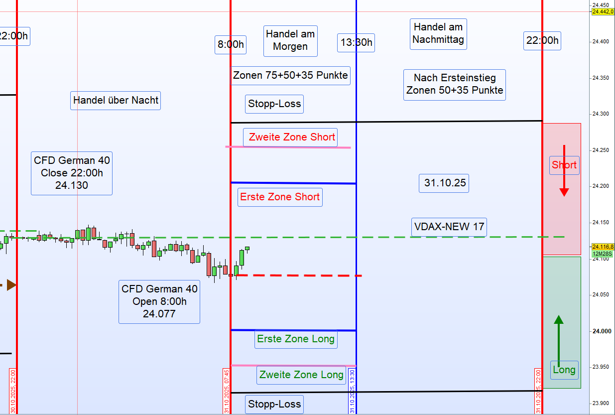 Heute Morgen, am 31.10.2025 um 8:00 Uhr, eröffnete der Markt bei 24 077 Punkten,