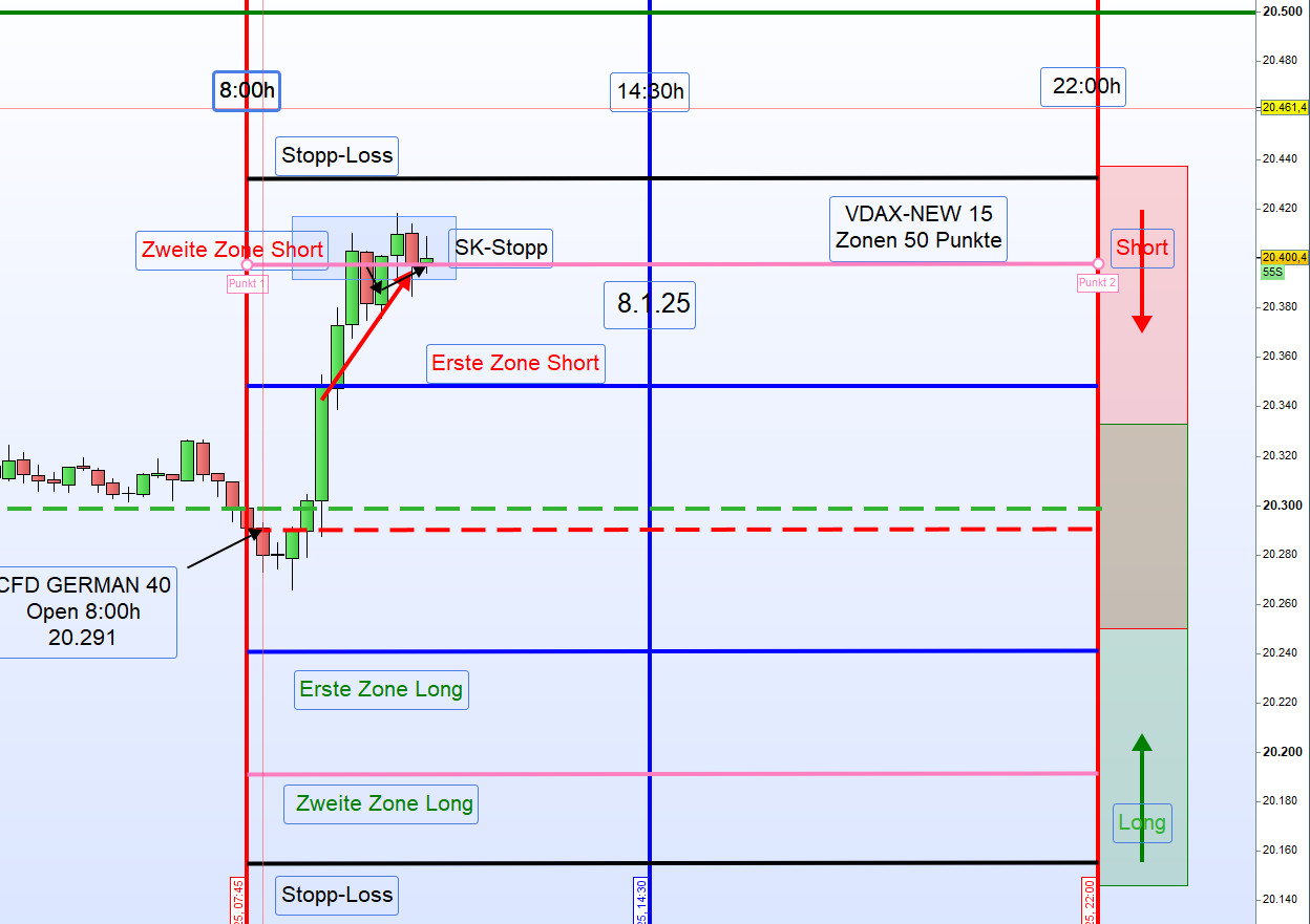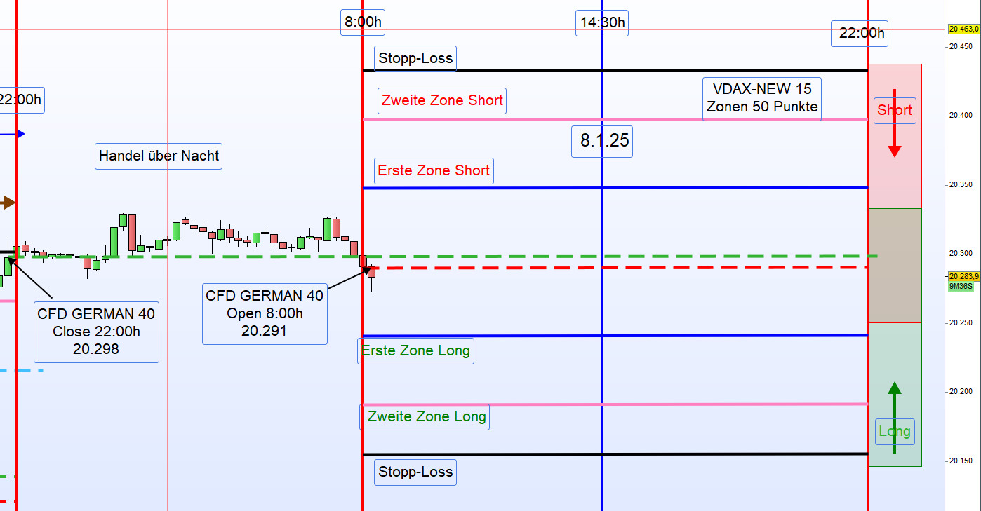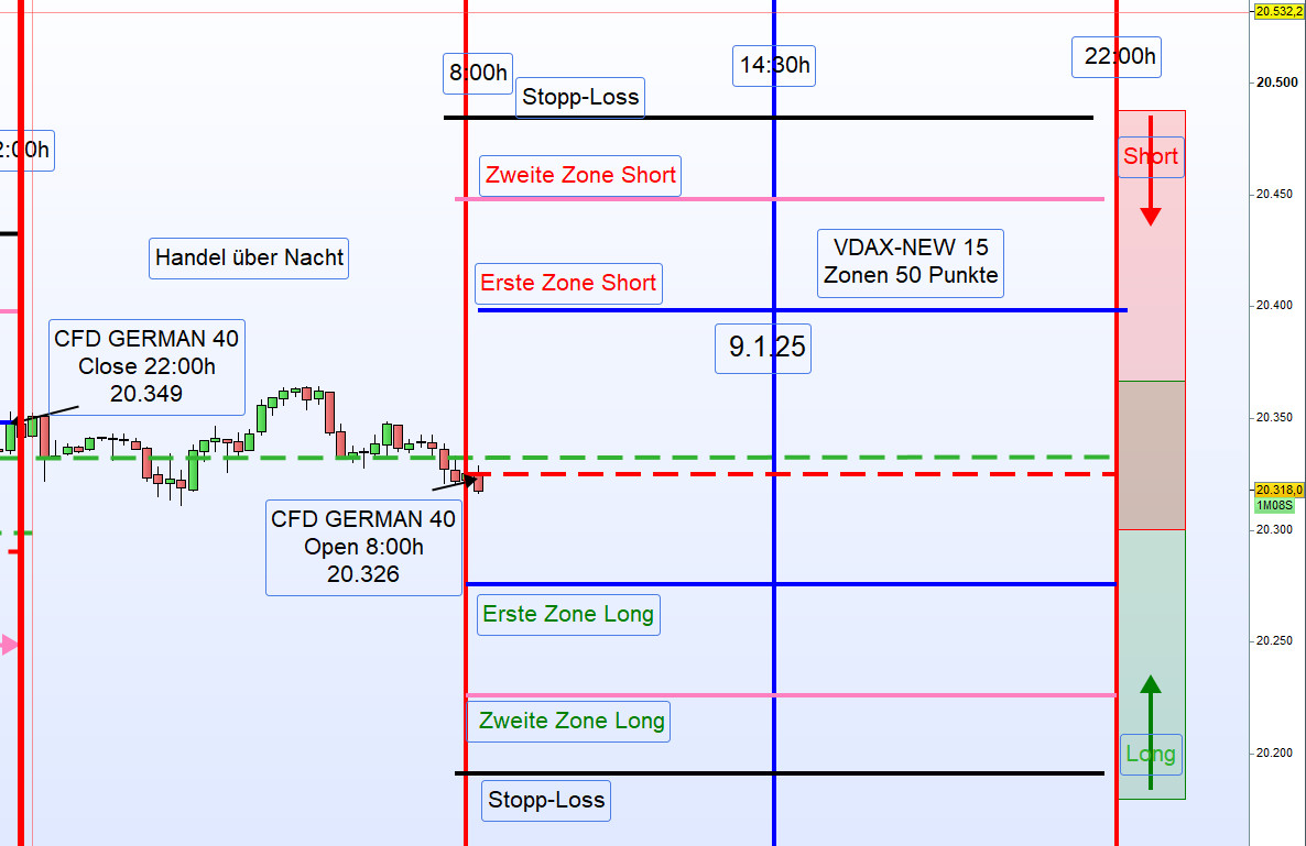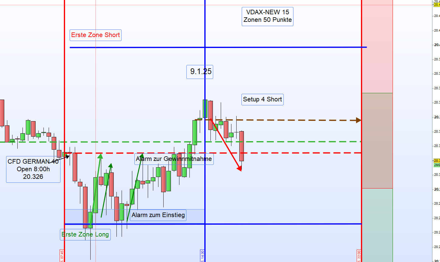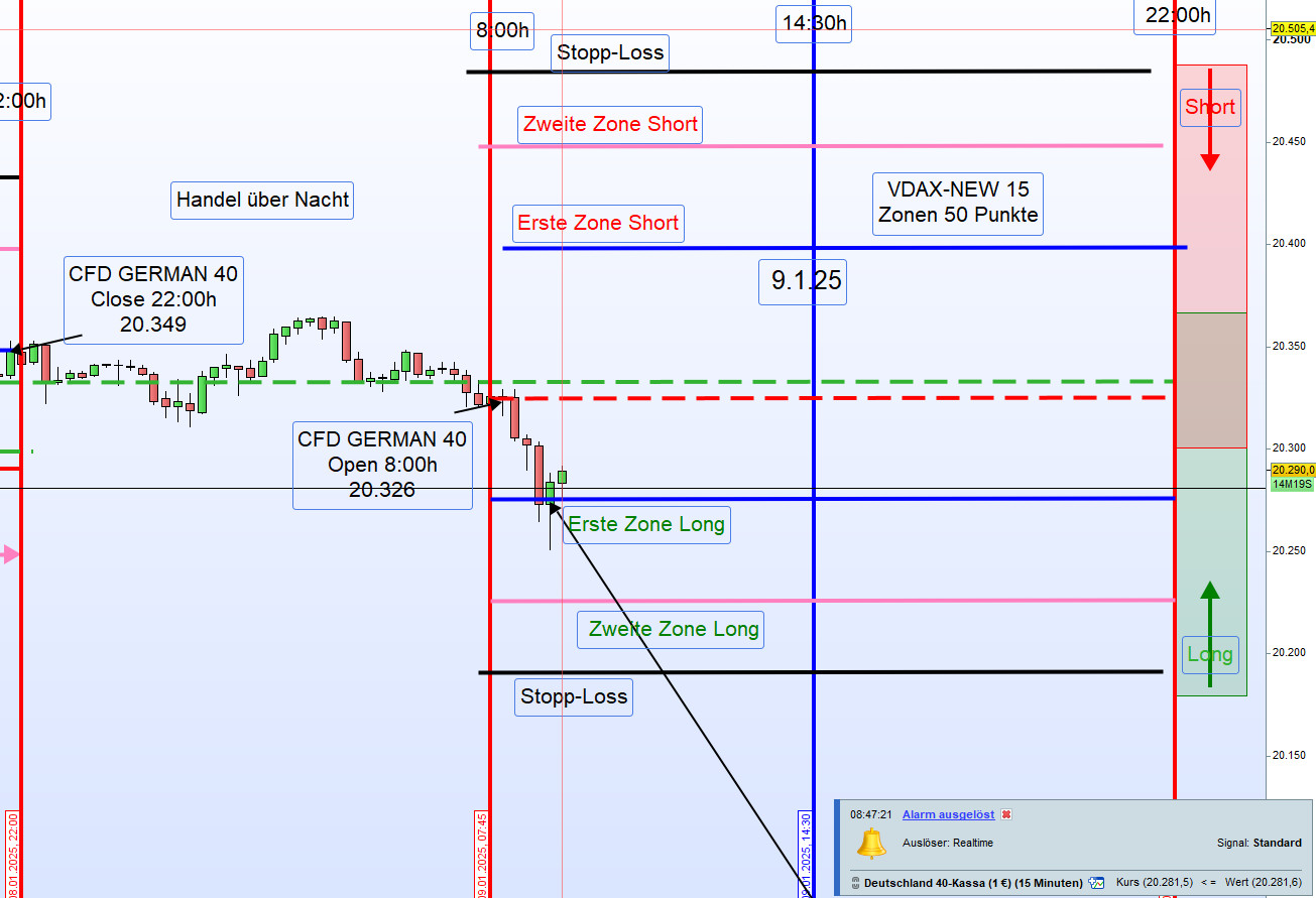 Am 9. Januar 2025 zeigte sich der Handel im DAX durch eine sehr geringe Handelsspanne von nur 100 Punkten und ein niedriges Handelsvolumen, was auf den US-Nationalfeiertag zurückzuführen war. Sämtliche Ergebnisse wurden aus der ersten Zone erzielt.