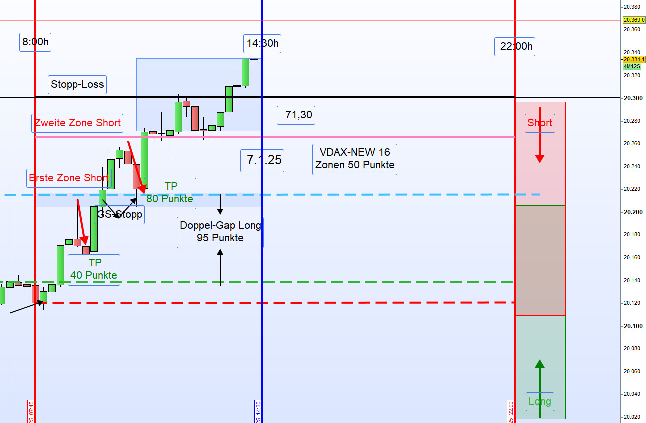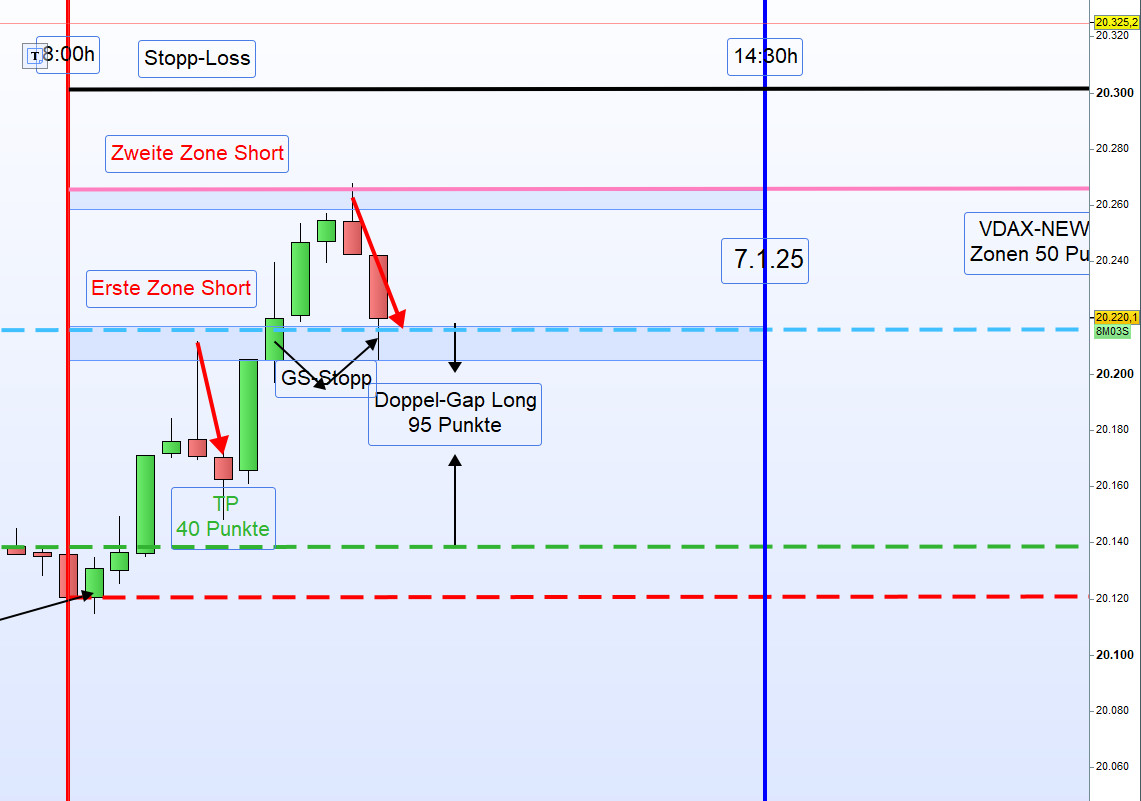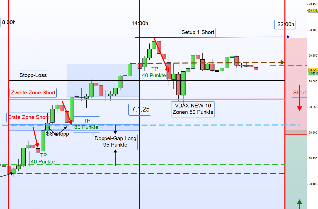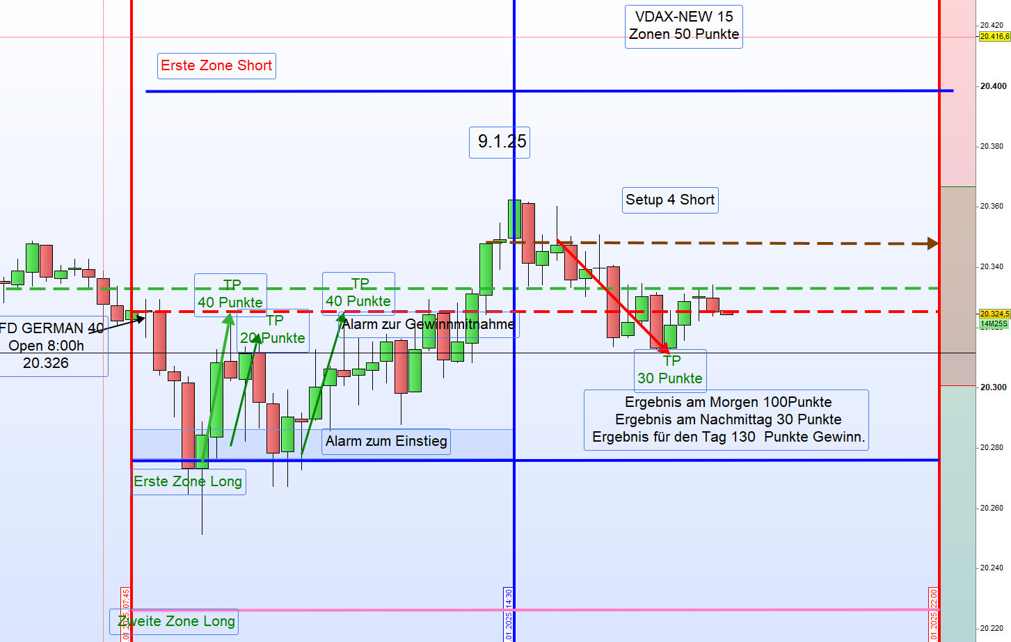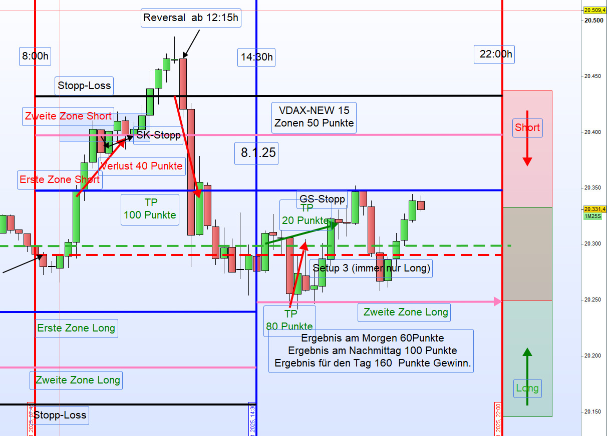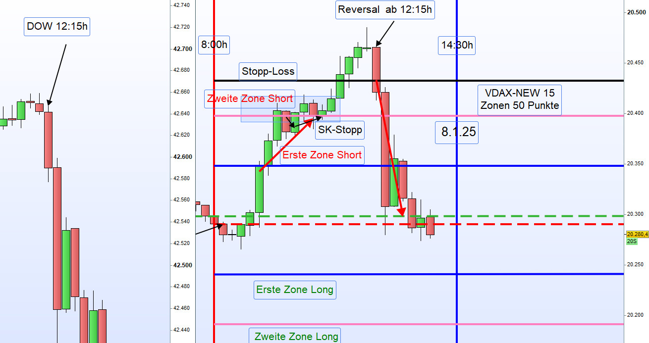 Am 9. Januar 2025 zeigte sich der Handel im DAX durch eine sehr geringe Handelsspanne von nur 100 Punkten und ein niedriges Handelsvolumen, was auf den US-Nationalfeiertag zurückzuführen war. Sämtliche Ergebnisse wurden aus der ersten Zone erzielt.
