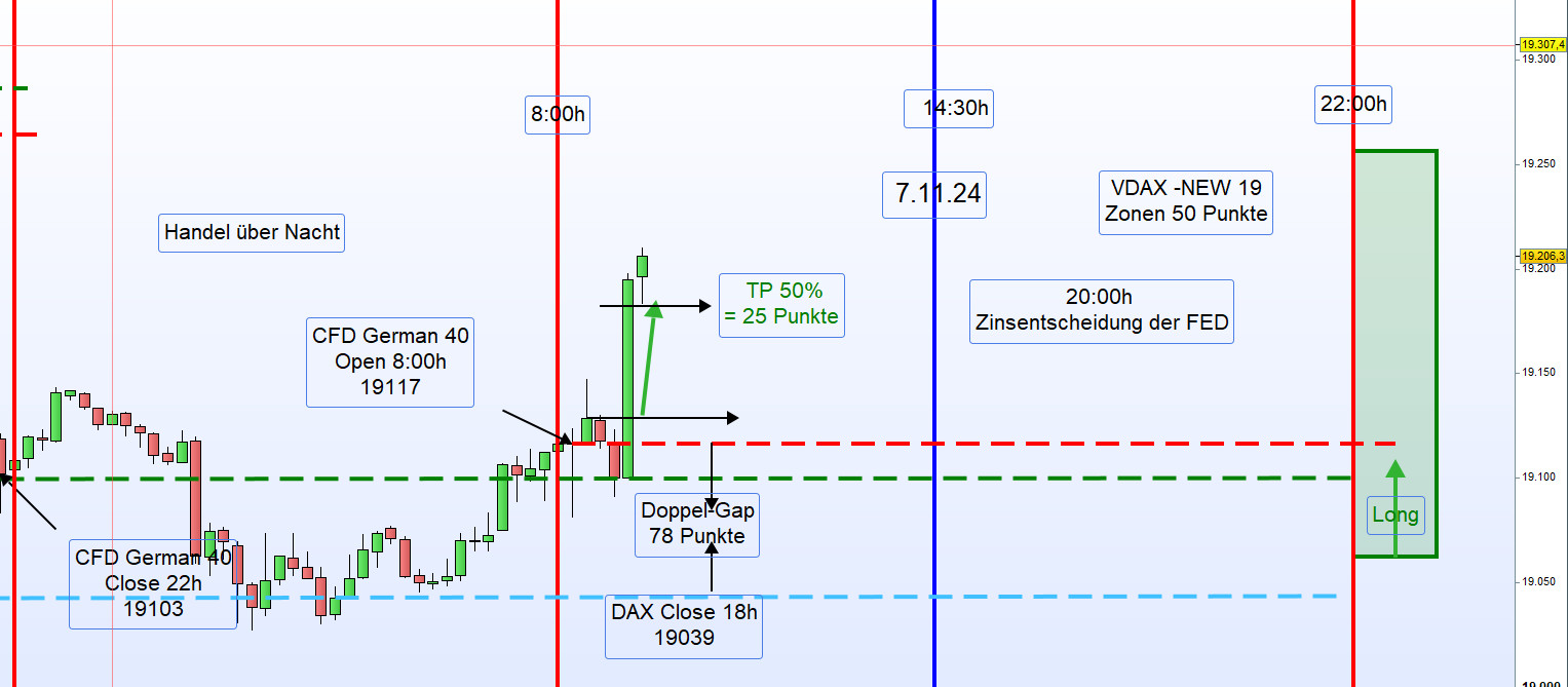 Am 7. November 2024 stieg der DAX um 1,7 %, während der DJIA nahezu unverändert blieb. Dieser Anstieg im DAX wurde durch die Zinssenkung der US-Notenbank (Fed) um 0,25 Prozentpunkte begünstigt, die Hoffnungen auf ein Ende der Zinserhöhungen in Europa weckte. Trotz politischer Unsicherheiten in Deutschland aufgrund interner Spannungen innerhalb der Regierungskoalition konzentrierten sich Investoren auf positive wirtschaftliche Signale.