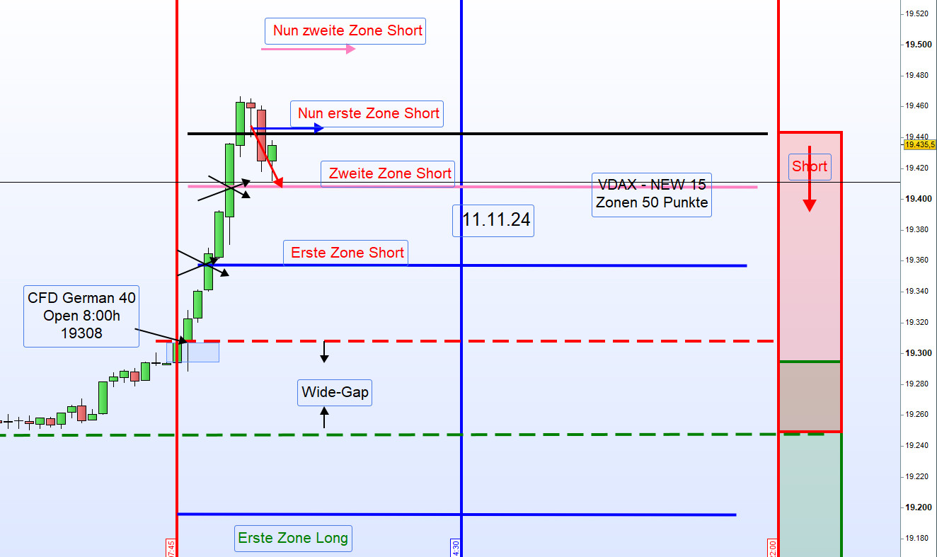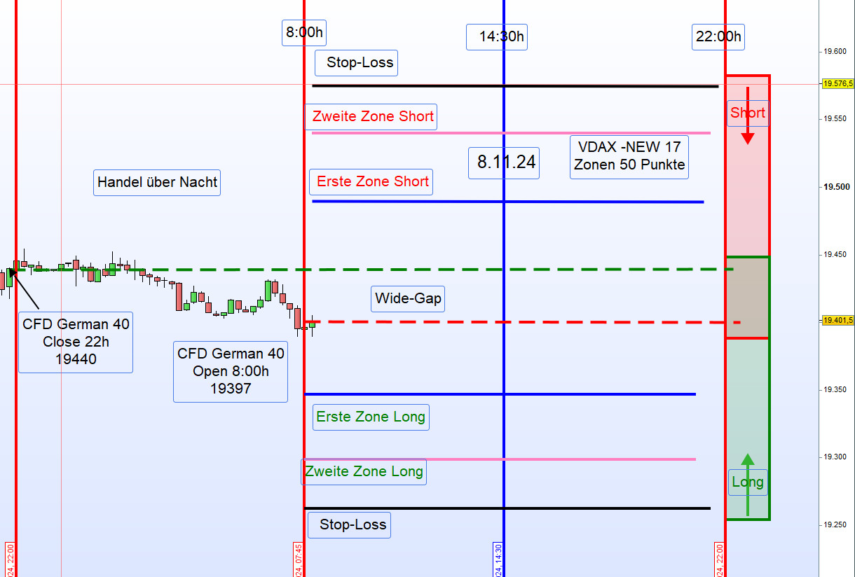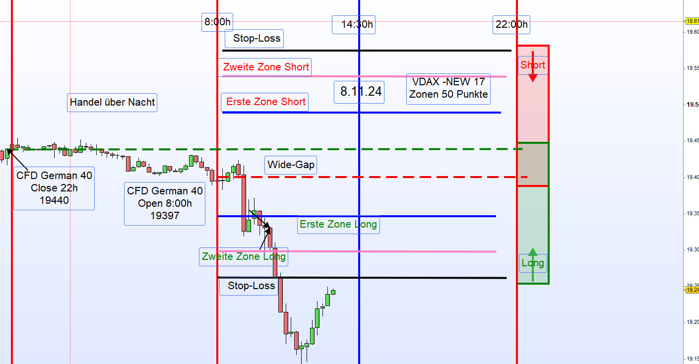 Am 8. November 2024 fällt der DAX jedoch signifikant. Dieser Rückgang könnte auf anhaltende politische Unsicherheiten in Deutschland und mögliche protektionistische Maßnahmen der USA zurückzuführen sein, die das Vertrauen der Investoren beeinträchtigen.
