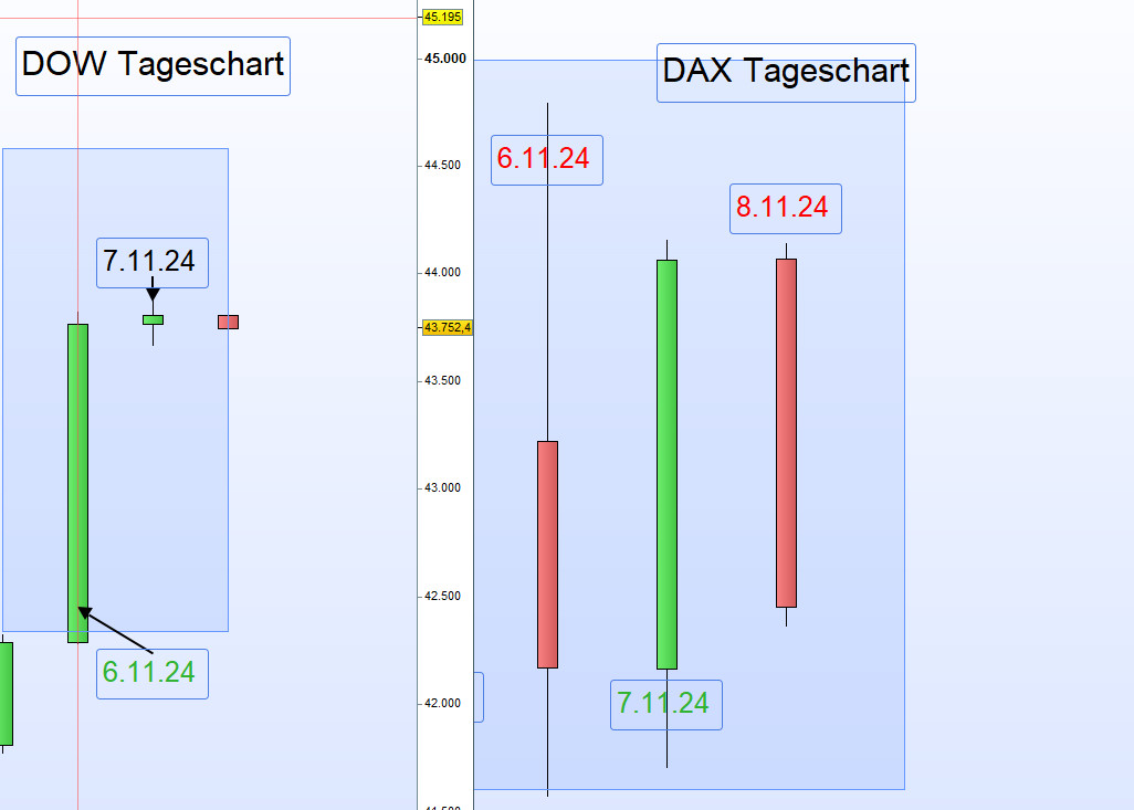 Zusammenfassend lässt sich sagen, dass die Entwicklungen von DAX und DJIA in diesen Tagen durch eine Kombination aus US-Wahlereignissen, geldpolitischen Entscheidungen und politischen Unsicherheiten in Deutschland beeinflusst wurden und werden