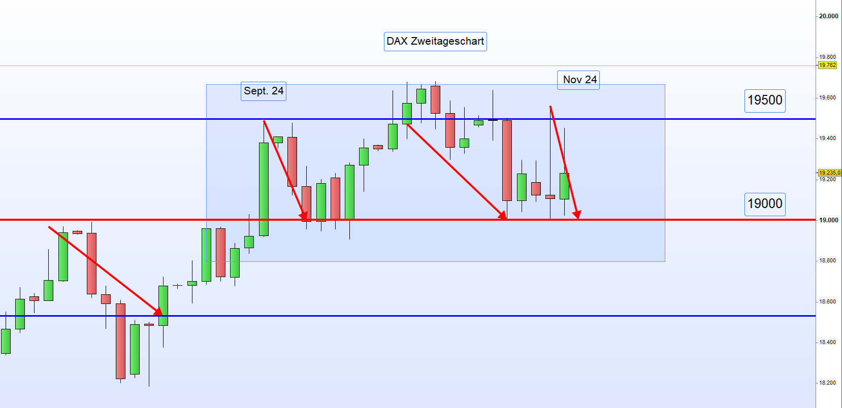 Der DAX befindet sich seit September 2024 in einer Seitwärtsbewegung zwischen 19.000 und dem Allzeithoch von 19.670 Punkten. Innerhalb dieses Bereichs hat der Index mehrfach Korrekturen von etwa 500 Punkten durchlaufen. Diese wiederkehrenden Schwankungen bieten Swing-Tradern attraktive Handelsmöglichkeiten.