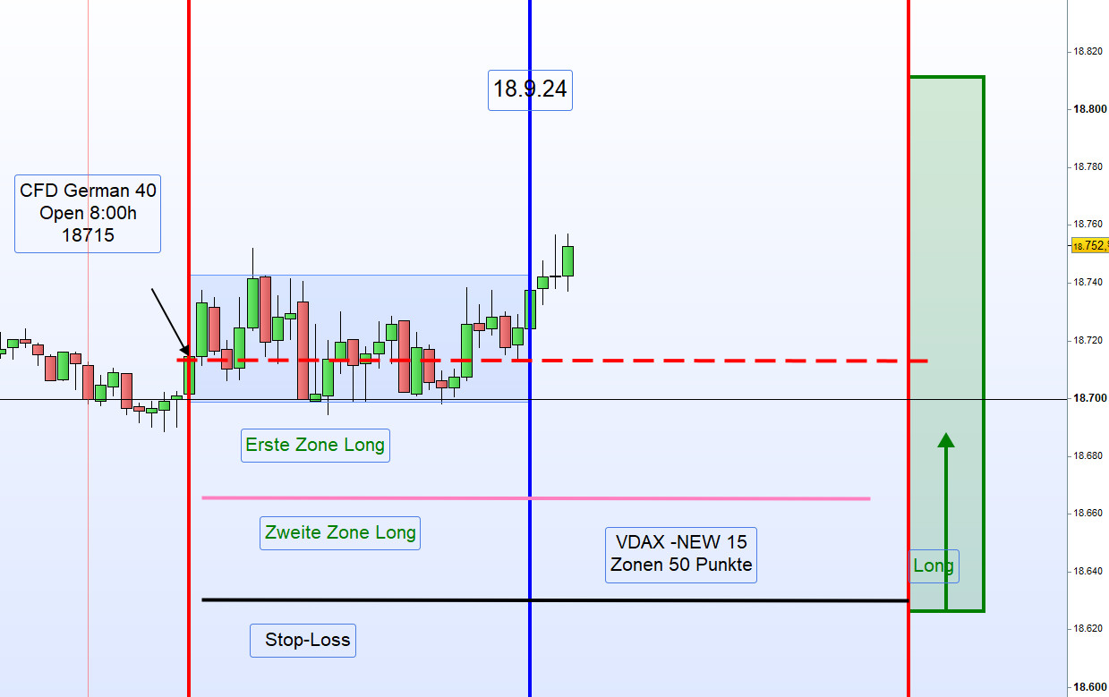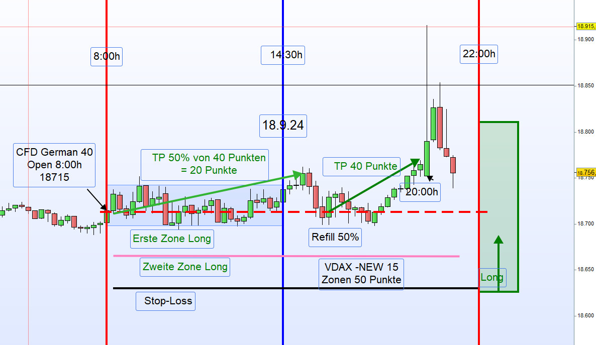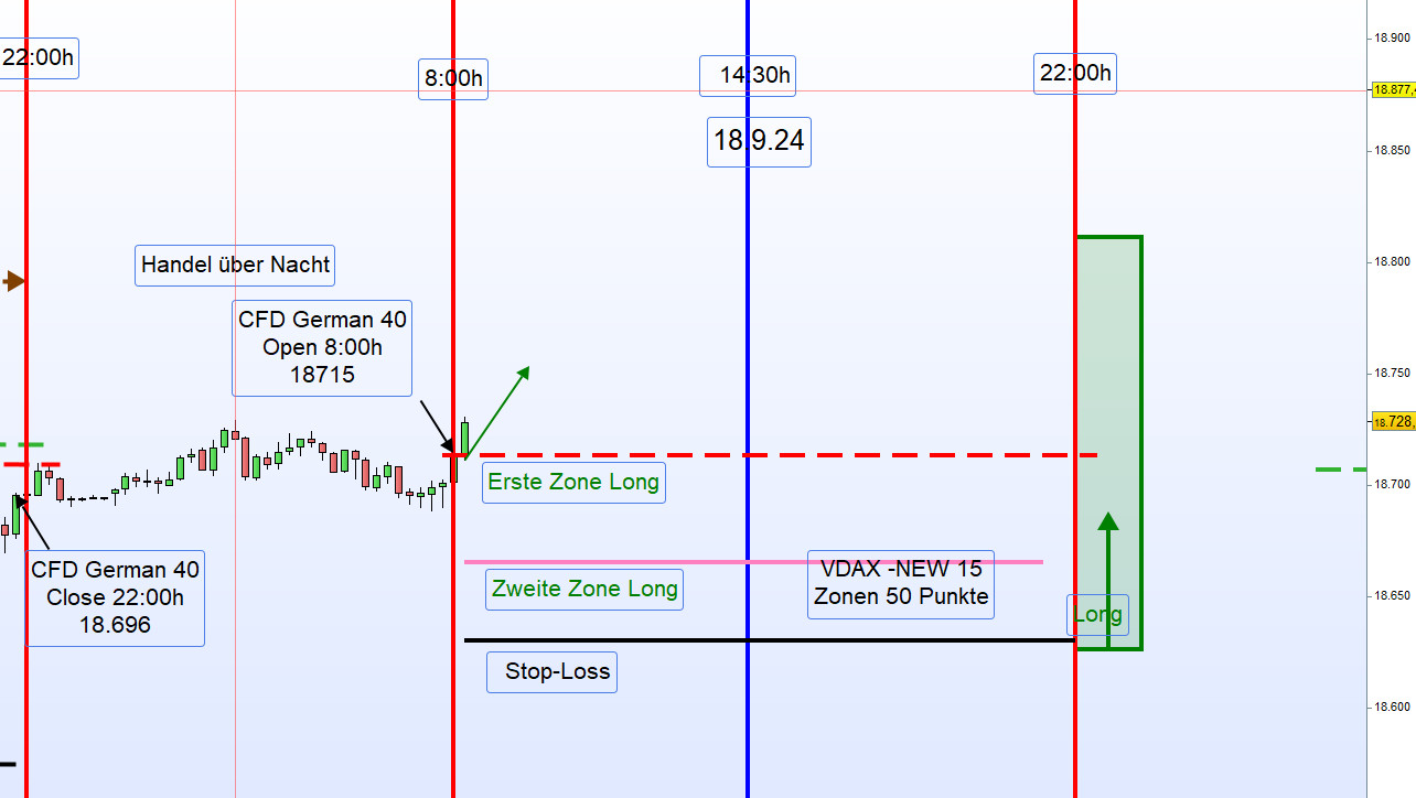 Trade Management: Nach Gewinn von 40-50 Punkten je nach Zonenbreite erfolgt eine Gewinnmitnahme (TP) von 50% der Kontrakte. Weitere 50% werden kurz vor 20:00h glattgestellt. Bei einem Kursrücksetzer wird die Anfangsposition um 50% aufgestockt und bei Gewinn werden wiederum 50% glattgestellt. Korrigiert der Kurs in die zweite Zone wird eine Position Long verdoppelt. Charttechnisch erfolgt für diesen Tag keine Unterteilung in Vor- und Nachmittag. -