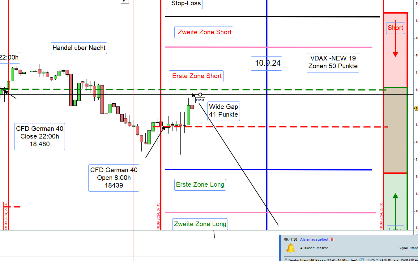 Wide-Gap Wide Gaps sind Notierungslücken zwischen dem Schlusskurs vom Vortag um 22:00h und dem Eröffnungskurs am Folgetag um 8:00h. Um als Wide-Gap zu gelten, muss die Differenz zwischen beiden Kursen +/- 40 Punkten ausmachen. Notiert jedoch der VDAX-NEW über 20 dann wird der Handel der Wide Gap erst nach einer Mindestlücke von 70 Punkten in Erwägung gezogen Gehandelt wird diese ab dem Vortagesschlusskurs, dann erste Aktionszone, mit dem Gewinnziel Eröffnungskurs um 8h. Es ist ein Revers Gap Close Handelsansatz. Die Eröffnung einer Position erfolgt gemäß dem Prinzip des Zonenhandels. Wurde die Position eröffnet, dann ist dies die erste Zone. Das Augenmerk liegt auf der Kursbewegung ab 9:00h, Eröffnung XETRA-Börse. Wird die Wide-Gap zügig durchgehandelt, dann erfolgt der Einstieg erst nach einer bullish oder bearish Umkehr-Kerze. Hammer und Inverted Hammer Teilgewinne ab 30 Punkte mitnehmen. Bei einem Rücklauf kann die Position wieder aufgefüllt werden (Refill).