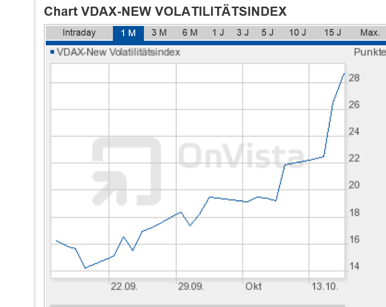 Zunächst betrachten wir den Volatilitäts-Index VDAX. Die Vola hat sich in kurzer Zeit von 14 auf 28 erhöht. Dies bedeutet erweiterte Aktionszonen,
