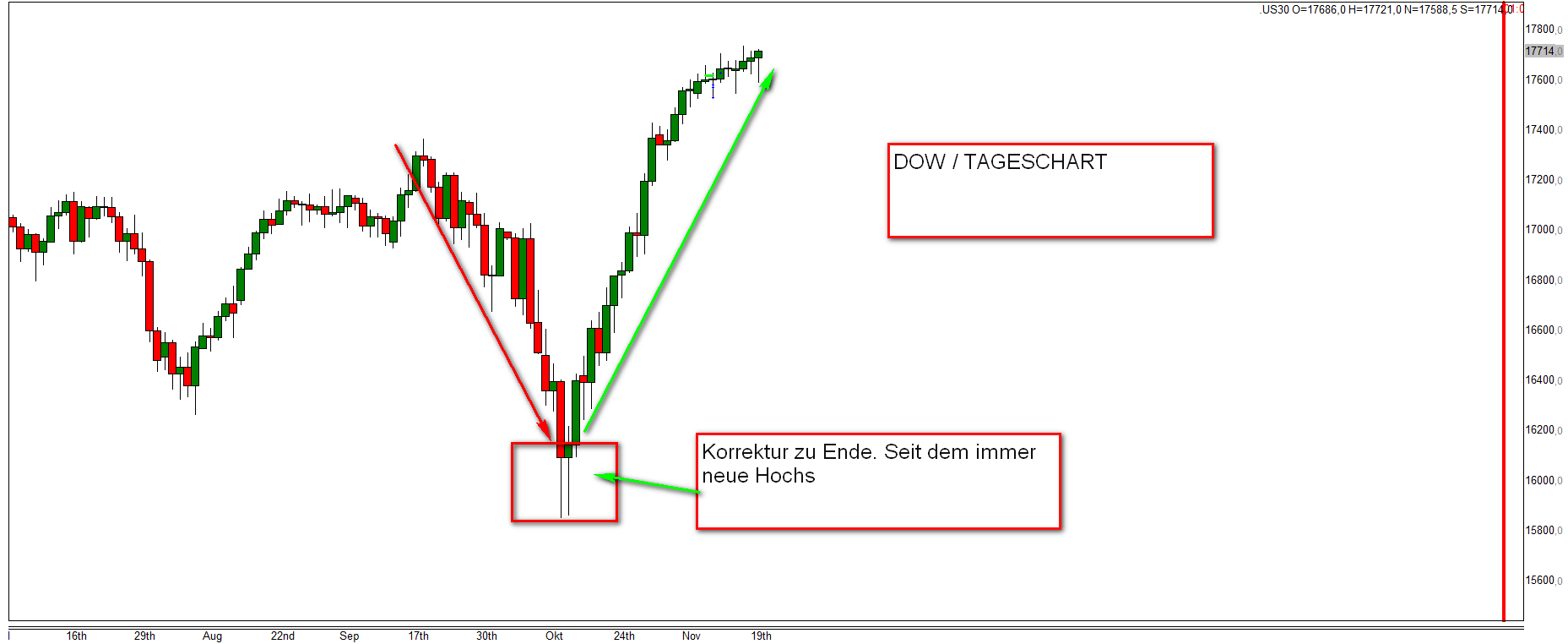 Ein bullisches Umfeld manifestiert sich nach einer Korrektur mit immer neuen Hochs. Weiterhin spielt auch die Saison, Jahresende, eine Rolle. Damit geht auch eine niedrige Vola/ VDAX einher.