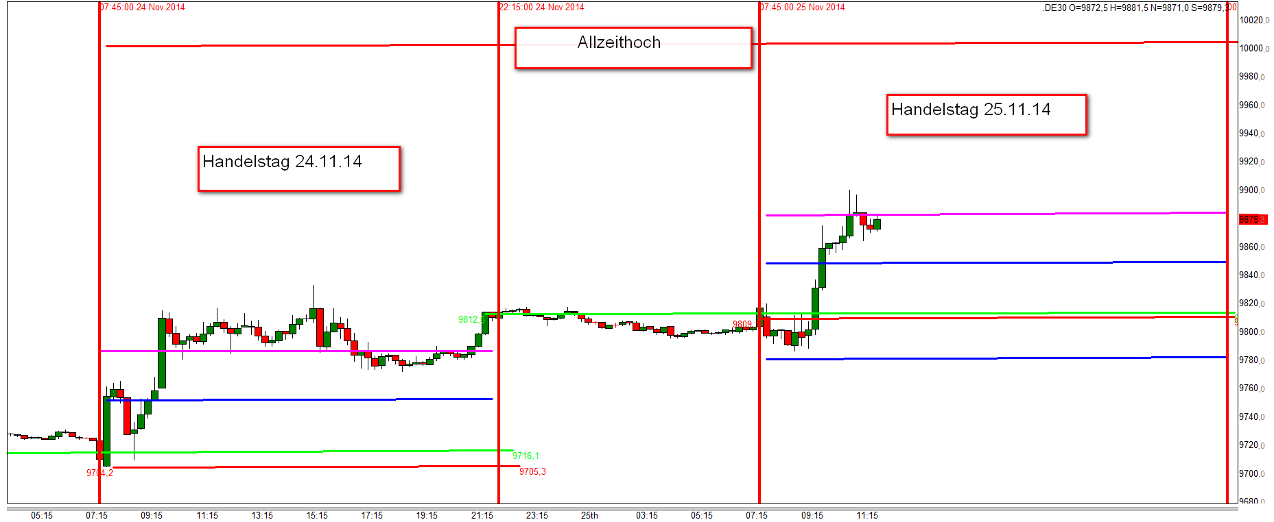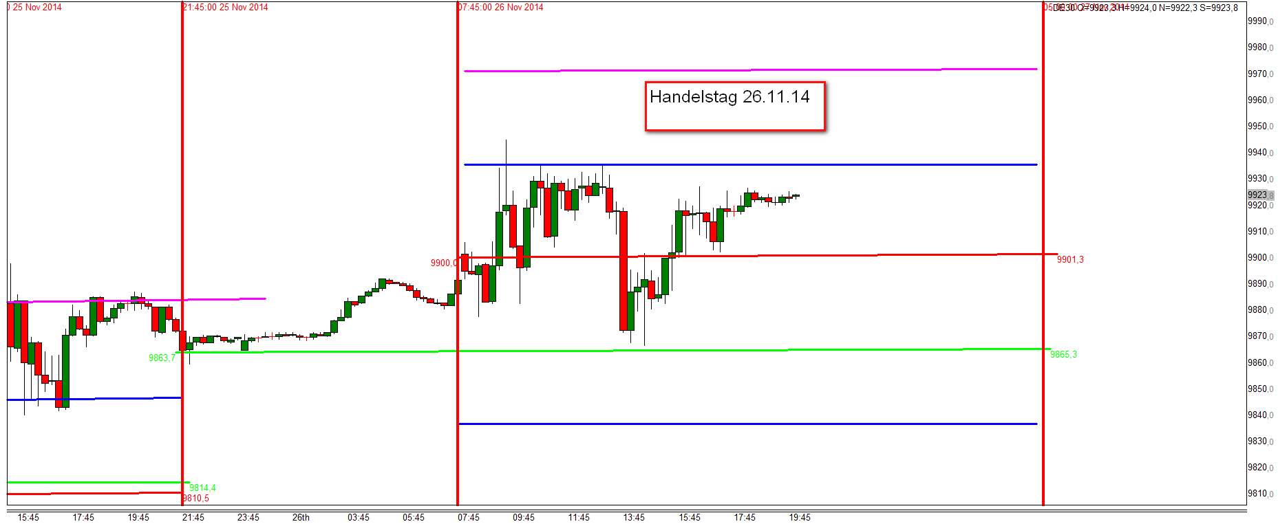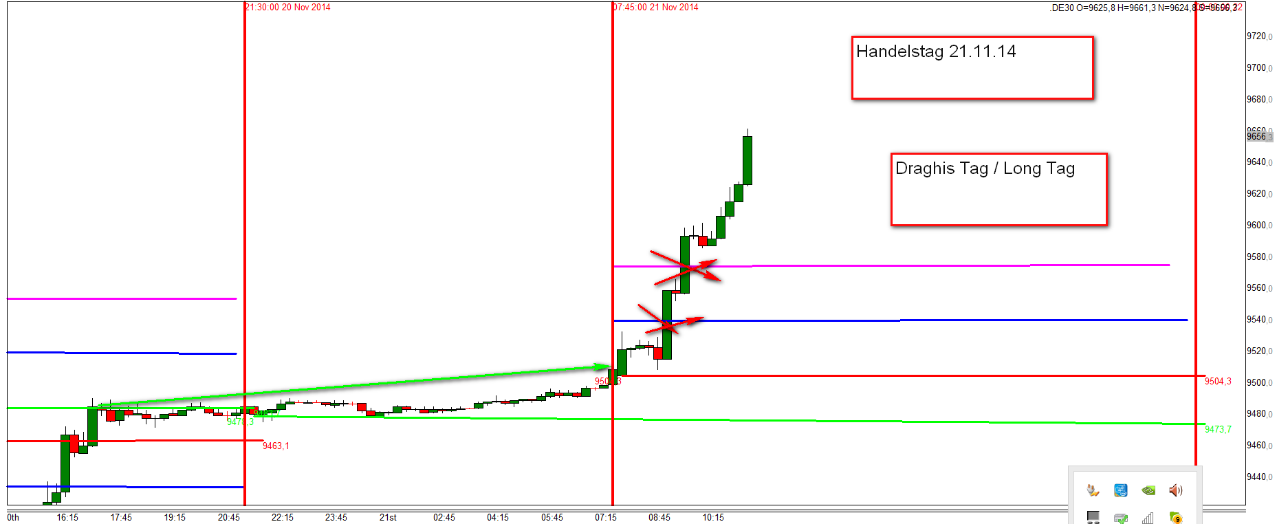 was mich wirklich wunderte war, dass Horst an der ersten Zone mit Limit einstieg. Bei der frühmorgentlichen Vorbereitung gehört unbedingt die Information über anstehende Veröffentlichungen: 09:30 DE Dienstleistungsindex November und 09:30 DE Einkaufsmanagerindex verarb. Gewerbe November. Diese negative Mitteilung hat den Kurssturz begleitet mit allen Stopp Losses verursacht. Habe für solche wichtigen Nachrichten immer den Finger am Trigger um mit dem Trend zu traden. Liebe derartige WRB weil diese, sobald alle sleeping orders ausgeführt wurden, sofort mit einem langen Docht zurückschnellen und wiederum für einen Einstieg genutzt werden können.