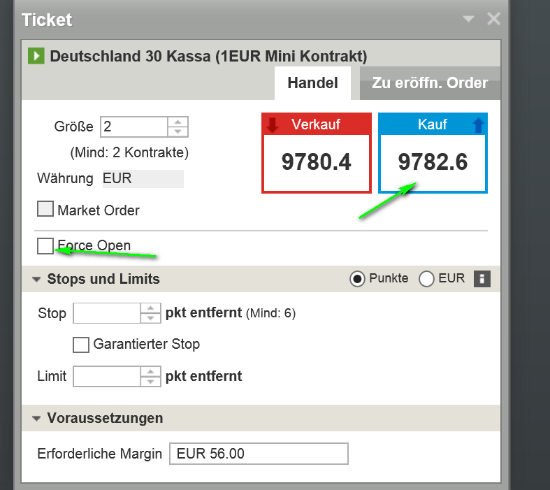 Haben wir uns für eine Richtung entschieden und die Stückzahl in der Ordermaske eingefügt, wird die Market Order erst dann ausgeführt, wenn sich der Kurs, zum Beispiel für long, ein Punkt höher notiert. In der eingefügten Order Maske von IG also 9783.